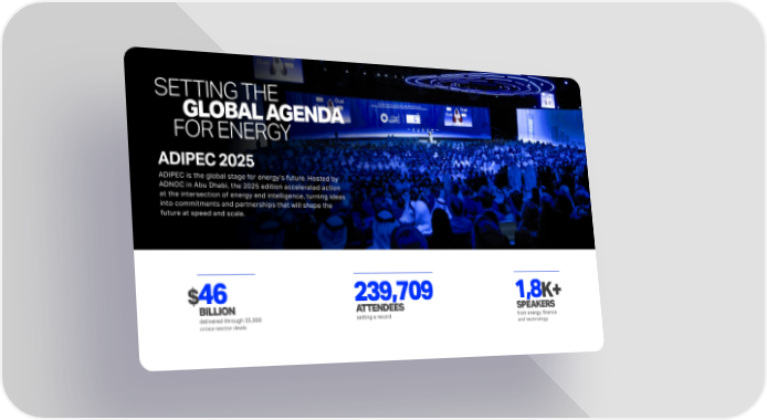 SETTING THE GLOBAL AGENDA FOR ENERGY ADIPEC 2025 ADIPEC is the global stage for energys future. Hosted by ADNOC in Abu Dhabi, the 2025 edition accelerated action at the intersection of energy and intelligence, turning ideas into commitments and partnerships that will shape the future at speed and scale. BILLION ATTENDEES SPEAKERS delivered through 35,000 cross-sector deals setting a record from energy, finance and technology $ 46 239,709 1,8 K+