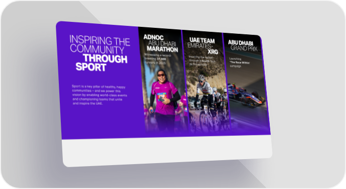 INSPIRING THE COMMUNITY THROUGH SPORT Sport is a key pillar of healthy, happy communities and we power this vision by enabling world-class events and championing teams that unite and inspire the UAE. ADNOC ABU DHABI MARATHON UAE TEAM EMIRATES- XRG ABU DHABI GRAND PRIX Witnessing a record- breaking 37,000 runners in 2025 Inspiring the nation through a fourth Tour de France title Launching The Race Within campaign