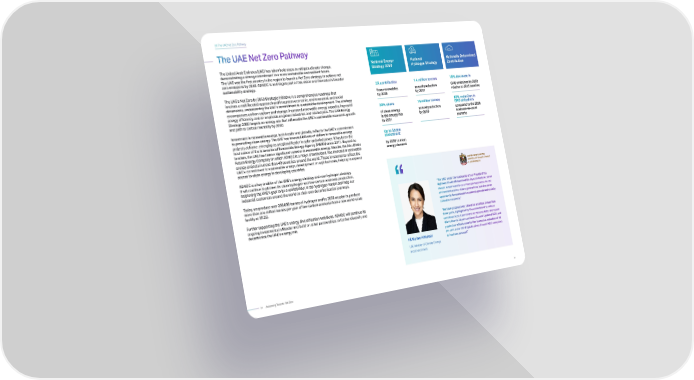 The United Arab Emirates (UAE) has taken bold steps to mitigate climate change, demonstrating a strong commitment to a more sustainable and resilient future. The UAE was the first country in the region to launch a Net Zero strategy to achieve net zero emissions by 2050. ADNOC is an integral part of this vision and the nations broader sustainability strategy. The UAEs Net Zero by 2050 Strategic Initiative is a comprehensive roadmap that involves a multifaceted approach and integrates economic, environmental, and social dimensions, underscoring the UAEs commitment to sustainable development. The strategy encompasses carbon capture and storage, increased renewable energy capacity, improved energy efficiency, and an emphasis on green industries and related jobs. The UAE Energy Strategy 2050 targets an energy mix that will enable the UAEs sustainable economic growth and path to carbon neutrality by 2050. Investment in renewable energy, both locally and globally, reflects the UAEs commitment to promoting clean energy. The UAE has invested billions of dollars in renewable energy projects at home, emerging as a regional leader in solar and wind power. It has been the host nation of the International Renewable Energy Agency (IRENA) since 2011. Beyond its borders, the UAE has been a significant investor in renewable energy. Masdar, the Abu Dhabi Future Energy Company (in which ADNOC is a major shareholder), has invested in renewable energy projects in more than 40 countries around the world. These investments reflect the UAEs commitment to sustainable energy development on a global scale, helping to expand access to clean energy in developing countries. ADNOC is a key enabler of the UAEs energy strategy and new hydrogen strategy. It will continue to pioneer its clean hydrogen and low-carbon ammonia production, bolstering the UAEs goal to be a world leader in the hydrogen market and help our industrial customers around the world on their own decarbonization journeys. Today, we produce over 300,000 tonnes of hydrogen and by 2030 we plan to produce more than one million tonnes per year of low-carbon ammonia from a new world-scale facility at TAZIZ. Further supporting the UAEs energy diversification ambitions, ADNOC will continue its ongoing investments in Masdar and build on other partnerships to further diversify and decarbonize the UAEs energy mix. HE Mariam Al Muhairi UAE Minister of Climate Change and Environment 3X contributio n from renewables by 2030 1.4 million tonnes annual production by 2031 19% decrease in GHG emissions by 2030 relative to 2019 baseline 30% share of clean energy in the energy mix by 2031 15 million tonnes annual production by 2050 40% reduction in GHG emissions compared to the 2030 business-as-usual scenario Up to $50bn investment by 2030 to meet energy demand National Energy Strategy 2050 National Hydrogen Strategy Nationally Determined Contribution H 2 CO 2 The UAE Net Zero Pathway 03 The UAE Net Zero Pathway The UAE, under the leadership of our President His Highness Sheikh Mohammed Bin Zayed Al Nahyan, views climate action not only as a strategic imperative for the environment and our future generations, but also as an opportunity for sustainable economic growth and socially inclusive prosperity. We have progressively raised our ambition in less than three years, highlighted by the commitment to reduce emissions by 23.5 per cent in our Second NDC; decreased this further to 31 per cent in our Second Updated NDC; and pushed our efforts even further to reach a reduction of 40 per cent in our Third Update of our Second NDC compared to business as usual. 21 20 Advancing Towards Net Zero