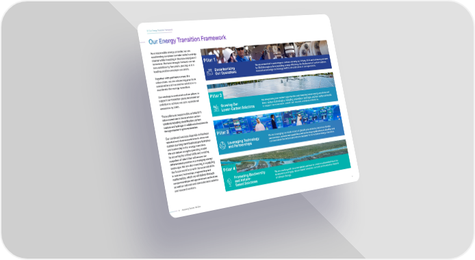 Decarbonizing Our Operations We are committed to reducing our carbon intensity by 25% by 2030 and achieving net zero by 2045 through actions including energy efficiency, the deployment of carbon capture, removal and storage technology and the electrification of our operations. CO 2 Growing Our Lower-Carbon Solutions We are growing new market opportunities and investing in new energy solutions and lower-carbon technologies, including renewables, hydrogen, and low-carbon ammonia to support our customers toward their net zero emissions ambitions. As a responsible energy provider, we are accelerating our plans to make todays energy cleaner while investing in the new energies of tomorrow. We have brought forward our net zero ambition by five years, placing us in a leading position amongst our peers. Together with partners across the value chain, we are advancing practical, sustainable and innovative solutions to accelerate the energy transition. Our strategy is anchored on four pillars to support our transition plans and meet our ambition to achieve net zero operational emissions by 2045 . These pillars are supported by an initial $15 billion investment in landmark low carbon solutions including electrification, carbon capture and hydrogen in addition to investments through Masdar to grow renewables. Our continued success depends on having a talented and diverse workforce to drive and sustain our long-term business performance and leadership in the energy transition. We will deliver an agile operating model by securing the critical skills and creating a pipeline of talent that will ensure our differentiated position in a changing energy landscape. We are also investing in equipping the future workforce with the essential skills in science, technology, engineering and mathematics, which we will deliver through our partnerships with government authorities as well as national and international academia and research centers. Our Energy Transition Framework 01 Our Energy Transition Framework Leveraging Technology and Partnerships We are leveraging our track record of global cross-industry and cross-border partnerships, operational capabilities and technology applications to develop and commercialize the technical solutions required for an inclusive energy transition. Promoting Biodiversity and Nature- Based Solutions We are working with local and global partners to create a sustainable future for biodiversity and apply nature-based solutions to minimize the adverse impacts of climate change . Pillar 1 Pillar 2 Pillar 4 Pillar 3 11 10 Advancing Towards Net Zero