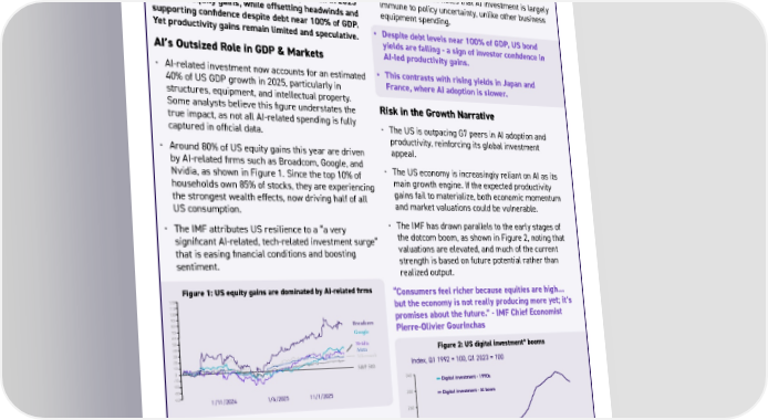 14 Current Market Reality AI now drives much of US growth and markets, accounting for roughly 40% of GDP expansion in 2025 and most equity gains, while offsetting headwinds and supporting confidence despite debt near 100% of GDP. Yet productivity gains remain limited and speculative. AI’s Outsized Role in GDP & Markets • AI-related investment now accounts for an estimated 40% of US GDP growth in 2025, particularly in structures, equipment, and intellectual property. Some analysts believe this figure understates the true impact, as not all AI-related spending is fully captured in official data. • Around 80% of US equity gains this year are driven by AI-related firms such as Broadcom, Google, and Nvidia, as shown in Figure 1. Since the top 10% of households own 85% of stocks, they are experiencing the strongest wealth effects, now driving half of all US consumption. • The IMF attributes US resilience to a “a very significant AI-related, tech-related investment surge” that is easing financial conditions and boosting sentiment. AI as a Buffer Against Headwinds • AI is offsetting the drag from tariffs, shrinking immigration, high debt, and policy uncertainty. • Goldman Sachs estimates the post-immigration bust could reduce US growth potential by 20%, but AI is increasingly viewed as a labor substitute. Since the first ENACT, tech stocks have outperformed the S&P and made an outsized contribution to GDP 1/11/2024 1/6/2025 11/1/2025 90 100 120 110 70 80 60 20 -20 30 -30 50 40 -40 0 10 -10 Broadcom Google Nvidia Meta Microsoft S&P 500 220 260 340 300 140 180 100 60 Index, Q1 1992 = 100, Q1 2023 = 100 Digital investment - 1990s Digital investment - Al boom * Computers & peripherals, software, communications equipment & facilities and electrical transmission & distribution 1992/2023 1994/2025 1996/2027 1998/2029 2000/2031 • Oxford Economics notes that AI investment is largely immune to policy uncertainty, unlike other business equipment spending. • Despite debt levels near 100% of GDP, US bond yields are falling - a sign of investor confidence in AI-led productivity gains. • This contrasts with rising yields in Japan and France, where AI adoption is slower. Risk in the Growth Narrative • The US is outpacing G7 peers in AI adoption and productivity, reinforcing its global investment appeal. • The US economy is increasingly reliant on AI as its main growth engine. If the expected productivity gains fail to materialize, both economic momentum and market valuations could be vulnerable. • The IMF has drawn parallels to the early stages of the dotcom boom, as shown in Figure 2, noting that valuations are elevated, and much of the current strength is based on future potential rather than realized output. “Consumers feel richer because equities are high... but the economy is not really producing more yet; it’s promises about the future.” - IMF Chief Economist Pierre-Olivier Gourinchas Source: FT Figure 1: US equity gains are dominated by AI-related firms Figure 2: US digital investment* booms Box 1: