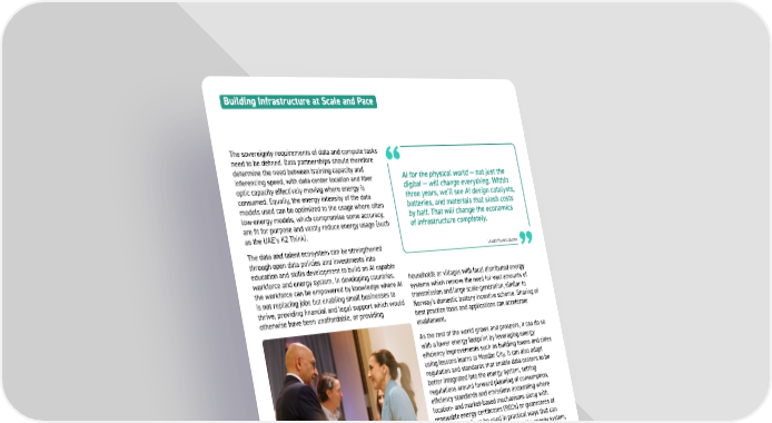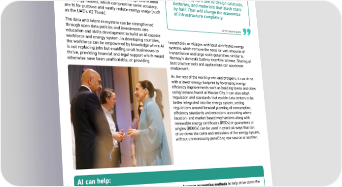 32 households or villages with local distributed energy systems which remove the need for vast amounts of transmission and large scale-generation, similar to Norway’s domestic battery incentive scheme. Sharing of best practice tools and applications can accelerate enablement. As the rest of the world grows and prospers, it can do so with a lower energy footprint by leveraging energy efficiency improvements such as building towns and cities using lessons learnt at Masdar City. It can also adopt regulation and standards that enable data centers to be better integrated into the energy system, setting regulations around forward planning of consumption, efficiency standards and emissions accounting where location- and market-based mechanisms along with renewable energy certificates (RECs) or guarantees of origins (REGOs) can be used in practical ways that can drive down the costs and emissions of the energy system, without unnecessarily penalizing one source or another. Building Infrastructure at Scale and Pace The sovereignty requirements of data and compute tasks need to be defined. Data partnerships should therefore determine the need between training capacity and inferencing speed, with data center location and fiber optic capacity effectively moving where energy is consumed. Equally, the energy intensity of the data models used can be optimized to the usage where often low-energy models, which compromise some accuracy, are fit for purpose and vastly reduce energy usage (such as the UAE’s K2 Think). The data and talent ecosystem can be strengthened through open data policies and investments into education and skills development to build an AI capable workforce and energy system. In developing countries, the workforce can be empowered by knowledge where AI is not replacing jobs but enabling small businesses to thrive, providing financial and legal support which would otherwise have been unaffordable, or providing AI can help: • Energy planning and grid optimization and resilience including the strategic placement of battery storage • Develop AI compute access strategies that balance domestic, sovereign and external needs, mapping the data ecosystem • Harness integrated benefits such as water, heating and cooling • Improve accounting methods to help drive down the cost, and emissions of power generation • Bring the capital needed to build generation capacity, including the acceleration of renewables and low carbon emissions energy such as SMRs and geothermal • Develop new economic architectures to provide the surge in capital required for the Intelligence Age Unattributed quote AI for the physical world — not just the digital — will change everything. Within three years, we’ll see AI design catalysts, batteries, and materials that slash costs by half. That will change the economics of infrastructure completely.