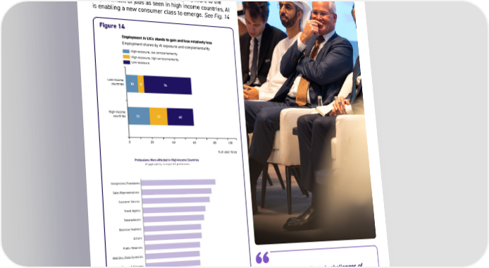 35 The Oxford Economics report realizes that the $75 trillion transformation in low-income countries requires deliberate sequencing, concluding “the next steps are clear: build the energy foundation, lay the finance rails, invest in applied skills, and embed trust.” Source: Oxford Economics, International Monetary Fund Figure 14 Employment in LICs stands to gain and lose relatively less Employment shares by AI exposure and complementarity High exposure, low complementarity Low-income countries High-income countries High exposure, high complementarity Low exposure % of labor force 0 20 40 60 80 100 18 33 27 40 8 74 score, max=1 Interpreters/Translators Sales Representatives Customer Service Travel Agents Telemarketers Business Teachers Editors Public Relations Web Dev./Data Scientists Financial Advisors Analysts Professions More Affected in High-Income Countries AI applicability in major US professions 0.1 0.2 0.3 0.4 0.5 0.6 0 Despite structural constraints, some low-income countries are already beginning to see the effects of this virtuous cycle. Access to digital banking with AI- generated credit scores is increasing individual and SME access to capital to get the cycle moving but legal, financial and marketing AI Agents to build their businesses. Here, far from increasing exposure to the displacement of jobs as seen in high income countries, AI is enabling a new consumer class to emerge. See Fig. 14 Unattributed quote If we can solve the twin challenges of energy and finance in developing countries, we could unlock $75 trillion in new global wealth. The world’s next leap in growth depends on providing reliable power and access to capital.