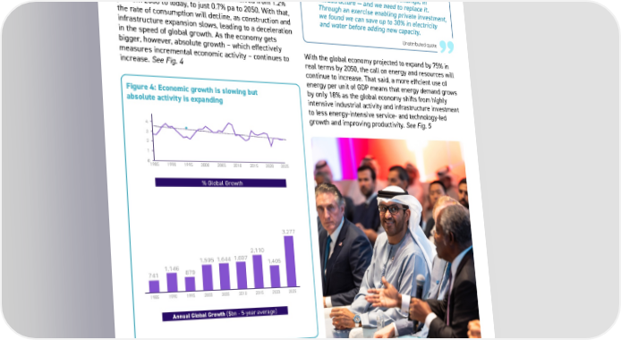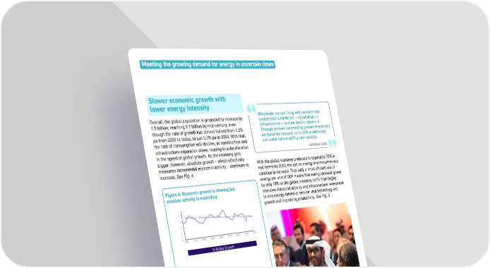 18 18 Meeting the growing demand for energy in uncertain times Overall, the global population is projected to increase by 1.5 billion, reaching 9.7 billion by mid-century, even though the rate of growth has almost halved from 1.2% pa from 2000 to today, to just 0.7% pa to 2050. With that, the rate of consumption will decline, as construction and infrastructure expansion slows, leading to a deceleration in the speed of global growth. As the economy gets bigger, however, absolute growth – which effectively measures incremental economic activity – continues to increase. See Fig. 4 Slower economic growth with lower energy intensity Figure 4: Economic growth is slowing but absolute activity is expanding Unattributed quote With the global economy projected to expand by 75% in real terms by 2050, the call on energy and resources will continue to increase. That said, a more efficient use of energy per unit of GDP means that energy demand grows by only 18% as the global economy shifts from highly intensive industrial activity and infrastructure investment to less energy-intensive service- and technology-led growth and improving productivity. See Fig. 5 0 1 2 3 4 5 1985 1990 1995 2000 2005 2010 2015 2020 2025 % Global Growth 741 1,146 879 1,595 1,644 1,697 2,110 1,405 3,277 1985 1990 1995 2000 2005 2010 2015 2020 2025 Annual Global Growth ($bn - 5-year average) Worldwide, we are living with an electricity system that is inefficient — in buildings, in infrastructure — and we need to replace it. Through an exercise enabling private investment, we found we can save up to 30% in electricity and water before adding new capacity.