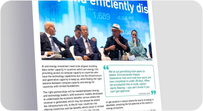 31 Unattributed quote 31 AI and energy investment need to be aligned, building data center capacity in countries which are energy rich, providing access to compute capacity to countries who have the technology capabilities but not the infrastructure and generation capacity to keep up, while finding the right balance between compute capacity and energy for countries with limited foundations. The right partnerships will be needed between energy and technology leaders, with economic models developed to understand the economic benefits versus where the revenue is generated, which may not always be where the infrastructure sits. In the AI race, countries risk offering incentives and tax benefits which result in limited domestic economic benefit if sustainable jobs are not created, water scarcity impacts agriculture and there is a lack of access to affordable energy for all. On the other hand, the energy demand of today’s hyperscalers can be equivalent to the size of a city supporting 4m households. This can enable vast generation capacity to be built in one go near cities which lack reliable access to energy, built ready to meet future demand growth where otherwise the building at scale would have been uneconomic. This could unlock otherwise unfeasible hydroelectric, geothermal, nuclear or gas projects in places where the source of energy is abundant, unlocking the full potential of the country’s energy ecosystem. The benefits of data centers could be significant with the right planning, integrating water, heating and cooling for district and agricultural use. Building power generation capacity with co-located data centers built with redundancy could also provide low-cost non-guaranteed domestic power (which will inevitably be better than the current availability). We’ve cut permitting from years to weeks. Environmental Impact Statements that once took four years are now completed in under 28 days. When we accomplish this at scale, capital starts flowing — you can’t invest if you can’t get approval.