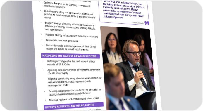 43 Proposed Solutions 8 Turbo-charge the Global Economy through Well-Funded Energy and AI OPTIMIZING THE ENERGY SYSTEM • Energy mapping to balance supply and demand and minimize energy, resource and capital intensity. • Optimize the grid, understanding centralized & distributed solutions • Build battery siting and optimization models and policies to maximize load factors and optimize grid usage • Support energy efficiency alliance to increase the efficiency of energy consumption, sharing AI tools and applications. • Produce energy infrastructure maturity assessment • Accelerate new tech generation • Better demands side management of Data Center usage and future baseload requirements. IMPROVE ACCESS TO, AND USE OF, CAPITAL • Define new capital market models which are more aligned to production capacity and minimizing the LCOE of the energy system, not individual projects • Drive adoption of new financial models such as catalytic equity and enterprise-backed credit to unlock capacity • Accelerate low-cost infrastructure-light solutions to increase access to energy intelligence • Increase access to online banking for all and easier access to credit scores MAXIMIZING THE VALUE OF DATA CENTER SITING • Defining archetypes for the next wave of sitings outside of US & China • Agreeing data partnerships to overcome constraints of data sovereignty • Aligning community integration with data centers for win-win solutions, including demand-side management tools. • Develop data center standards for use of market vs location-based accounting and efficiency • Develop regional tech maturity and talent scores Unattributed quote For the first time in human history, you can take a kilowatt of electricity and turn it directly into intelligence. But we cannot achieve the dream of artificial intelligence without more power. Power is knowledge now.