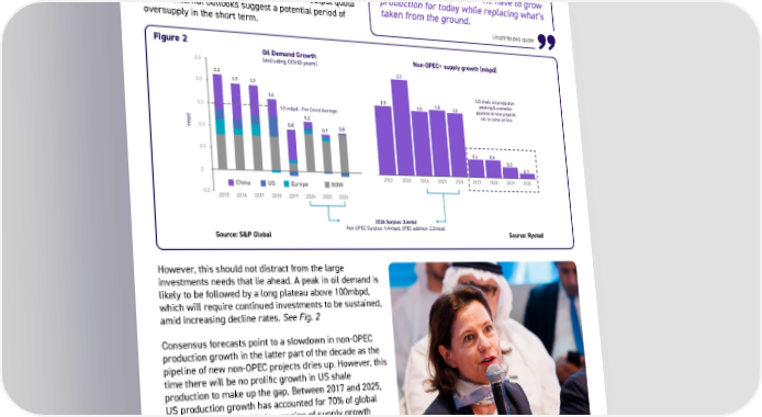 13 We’ve got to maintain a long-term view to meet this ever-growing demand. Oil and gas are depleting resources — we have to grow production for today while replacing what’s taken from the ground. 13 Against an increasingly uncertain long-term outlook, the industry faces short-term challenges. Oil demand growth is structurally slowing, as we move closer to peak demand, while supply growth remains robust amid a short-term wave of new supplies from non-OPEC+ (mainly Latam). At the same time, OPEC+ is pivoting to a market share strategy, unwinding previous output quota limits. External outlooks suggest a potential period of oversupply in the short term. Consensus forecasts point to a slowdown in non-OPEC production growth in the latter part of the decade as the pipeline of new non-OPEC projects dries up. However, this time there will be no prolific growth in US shale production to make up the gap. Between 2017 and 2025, US production growth has accounted for 70% of global demand growth. As this key engine of supply growth fades, higher investments elsewhere will be required to ensure adequate supplies to markets. With pressure to return dividends to shareholders and buy back shares, the industry needs to carefully navigate challenging short-term conditions while investing adequately to meet future demand amidst competition for capital from other sectors and industries. Unattributed quote However, this should not distract from the large investments needs that lie ahead. A peak in oil demand is likely to be followed by a long plateau above 100mbpd, which will require continued investments to be sustained, amid increasing decline rates. See Fig. 2 China US 1.2 0.8 1.9 1.6 2.2 1.9 1.0 1.5 2.5 2.0 0 0.5 mbpd Oil Demand Growth (excluding COVID years) Europe ROW -0.5 0.7 0.8 2024 2019 2017 2018 2015 2016 2025 2026 2.2 1.5 1.5 1.8 1.5 0.4 0.4 0.3 0.1 1.5 mbpd - Pre Covid Average 2027 2026 2024 2025 2022 2023 2028 2029 2030 US shale oil production peaking & a smaller pipeline of new projects set to come on line 2026 Surplus: 3.6mbd Non-OPEC Surplus: 1.4mbpd; OPEC addition: 2.2mbpd Non-OPEC+ supply growth (mbpd) Figure 2 Source: S&P Global Source: Rystad