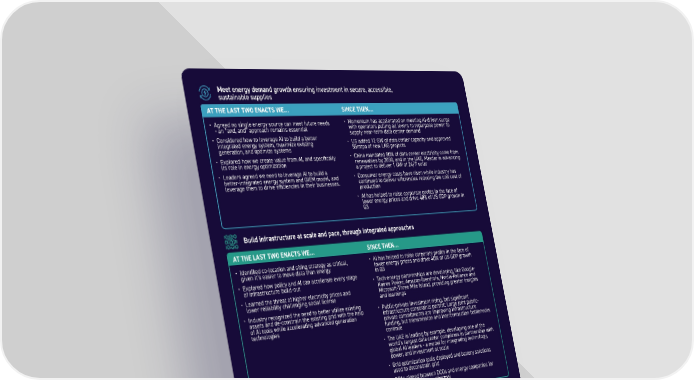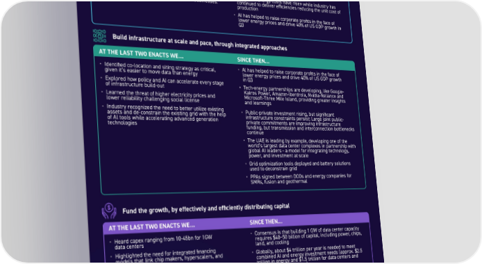 7 And underpinning it all: People, Policy & Permitting: we need skilled workforces and cultures that embrace AI; and smarter, faster, more predictable regulatory frameworks, where permitting becomes a catalyst, not a constraint. Meet energy demand growth ensuring investment in secure, accessible, sustainable supplies Fund the growth, by effectively and efficiently distributing capital Build infrastructure at scale and pace, through integrated approaches • Momentum has accelerated on meeting AI-driven surge with operators pulling all levers to repurpose power to supply near-term data center demand • US added 12 GW of data center capacity and approved 55mtpa of new LNG projects • China mandated 80% of data center electricity come from renewables by 2030, and in the UAE, Masdar is advancing a project to deliver 1 GW of 24/7 solar • Consumer energy costs have risen while industry has continued to deliver efficiencies reducing the unit cost of production • AI has helped to raise corporate profits in the face of lower energy prices and drive 40% of US GDP growth in Q3 • Al has helped to raise corporate profits in the face of lower energy prices and drive 40% of US GDP growth in Q3 • Tech-energy partnerships are developing, like Google- Kairos Power, Amazon-Iberdrola, Nvidia-Reliance and Microsoft-Three Mile Island, providing greater insights and learnings • Public-private investment rising, but significant infrastructure constraints persist: Large joint public- private commitments are improving infrastructure funding, but transmission and interconnection bottlenecks continue • The UAE is leading by example, developing one of the world’s largest data center complexes in partnership with global AI leaders - a model for integrating technology, power, and investment at scale • Grid optimization tools deployed and battery solutions used to deconstrain grid • PPAs signed between DCOs and energy companies for SMRs, fusion and geothermal • Consensus is that building 1 GW of data center capacity requires $40–50 billion of capital, including power, chips, land, and cooling • Globally, about $4 trillion per year is needed to meet combined AI and energy investment needs (approx. $2.5 trillion in energy and $1.5 trillion for data centers and associated infrastructure) • Competition for capital is intensifying - energy projects must now rival AI infrastructure for investor attention • Concentration of the majority of new data center investment remains anchored in the US and mature markets with limited diversification into emerging regions SINCE THEN… SINCE THEN… SINCE THEN… • Agreed no single energy source can meet future needs - an “and, and” approach remains essential • Considered how to leverage AI to build a better integrated energy system, maximize existing generation, and optimize systems • Explored how we create value from AI, and specifically its role in energy optimization • Leaders agreed we need to leverage Al to build a better-integrated energy system and GIEM model, and leverage them to drive efficiencies in their businesses. • Identified co-location and siting strategy as critical, given it’s easier to move data than energy • Explored how policy and AI can accelerate every stage of infrastructure build-out • Learned the threat of higher electricity prices and lower reliability challenging social license • Industry recognized the need to better utilize existing assets and de-constrain the existing grid with the help of Al tools while accelerating advanced generation technologies • Heard capex ranging from 10-45bn for 1GW data centers • Highlighted the need for integrated financing models that link chip makers, hyperscalers, and energy producers • Explored how innovative financing such as catalytic equity and enterprise-backed credit can unlock capacity AT THE LAST TWO ENACTS WE… AT THE LAST TWO ENACTS WE… AT THE LAST TWO ENACTS WE… 7