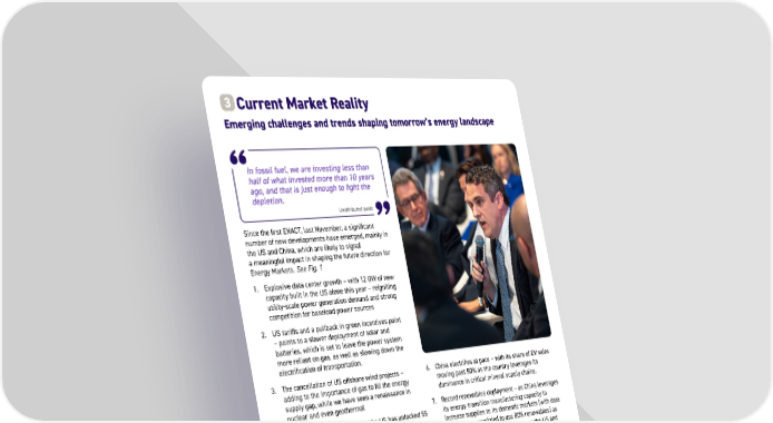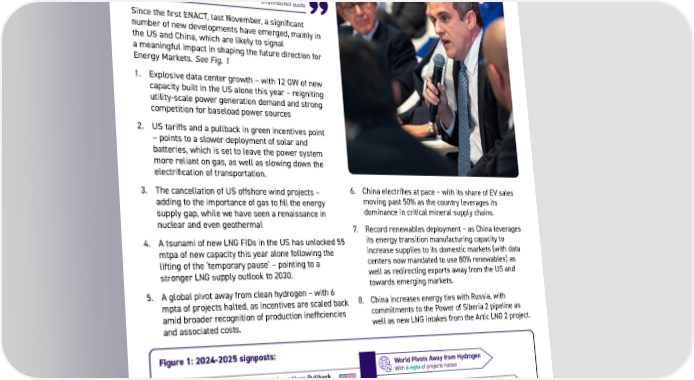 12 In fossil fuel, we are investing less than half of what invested more than 10 years ago, and that is just enough to fight the depletion. Since the first ENACT, last November, a significant number of new developments have emerged, mainly in the US and China, which are likely to signal a meaningful impact in shaping the future direction for Energy Markets. See Fig. 1 1. Explosive data center growth – with 12 GW of new capacity built in the US alone this year – reigniting utility-scale power generation demand and strong competition for baseload power sources 2. US tariffs and a pullback in green incentives point – points to a slower deployment of solar and batteries, which is set to leave the power system more reliant on gas, as well as slowing down the electrification of transportation. 3. The cancellation of US offshore wind projects – adding to the importance of gas to fill the energy supply gap, while we have seen a renaissance in nuclear and even geothermal 4. A tsunami of new LNG FIDs in the US has unlocked 55 mtpa of new capacity this year alone following the lifting of the ‘temporary pause’ – pointing to a stronger LNG supply outlook to 2030. 5. A global pivot away from clean hydrogen – with 6 mpta of projects halted, as incentives are scaled back amid broader recognition of production inefficiencies and associated costs. 6. China electrifies at pace – with its share of EV sales moving past 50% as the country leverages its dominance in critical mineral supply chains. 7. Record renewables deployment – as China leverages its energy transition manufacturing capacity to increase supplies to its domestic markets (with data centers now mandated to use 80% renewables) as well as redirecting exports away from the US and towards emerging markets. 8. China increases energy ties with Russia, with commitments to the Power of Siberia 2 pipeline as well as new LNG intakes from the Artic LNG 2 project. Current Market Reality Emerging challenges and trends shaping tomorrow’s energy landscape 3 Unattributed quote Tsunami of LNG FIDs 55 mpta of new FIDs in 2025 post permit pause US Tariffs & Green Incentives Pullback Slower US solar & battery projects plus EV adoption World Pivots Away from Hydrogen With 6 mpta of projects halted US Offshore Wind Projects Cancellation of projects Explosive Data Center Growth 12 GW of additional capacity reignites utility scale power generation China Increases Energy Ties with Russia With commitment to PoS2 and Arctic LNG exports China Electrifies at Pace Share of EV sales >50% Owns 60-90% of critical minerals supply chain Record Renewables Deployment China redirects energy transition capacity to EMs data centers mandated to use 80% renewables Figure 1: 2024-2025 signposts: