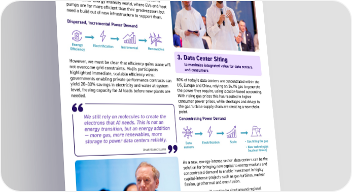 9 Energy companies are struggling to keep up with the current surge in demand and as such the world must focus on doing more with less energy. Electrification is key to a lower energy intensity world, where EVs and heat pumps are far more efficient than their predecessors but need a build out of new infrastructure to support them. 80% of today’s data centers are concentrated within the US, Europe and China, relying on 26.4% gas to generate the power they require, using location-based accounting. With rising gas prices this has resulted in higher consumer power prices, while shortages and delays in the gas turbine supply chain are creating a new choke point. Electrification Scale Data centers Concentrating Power Demand • Gas filling the gap • New technologies (nuclear fission) Electrification Incremental Energy Efficiency Dispersed, Incremental Power Demand Renewables As a new, energy-intense sector, data centers can be the solution for bringing new capital to energy markets and concentrated demand to enable investment in highly capital-intense projects such as gas turbines, nuclear fission, geothermal and even fusion. Data centers will need to be sited around regional archetypes based on access to abundant low-cost energy, talent, and resources able not just to consume but also drive build-out, integrated value such as water, cooling and heating (into residential, agriculture etc.) and availability of capital. Participants added three siting imperatives: co-locate compute with generation to bypass transmission bottlenecks; pair gas with renewables and batteries to deliver cleaner-firm profiles; and engage communities early on water and price impacts to sustain a social license to build. However, we must be clear that efficiency gains alone will not overcome grid constraints. Majlis participants highlighted immediate, scalable efficiency wins: governments enabling private performance contracts can yield 20–30% savings in electricity and water at system level, freeing capacity for AI loads before new plants are needed. We still rely on molecules to create the electrons that AI needs. This is not an energy transition, but an energy addition — more gas, more renewables, more storage to power data centers reliably. Unattributed quote 2. Doing More with Less 3. Data Center Siting to maximize integrated value for data centers and consumers in a more energy efficient world