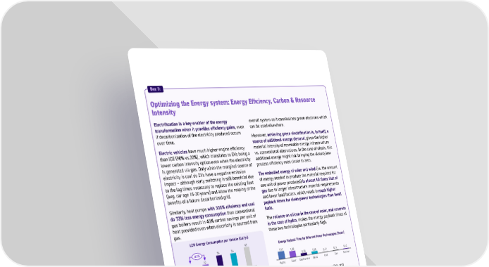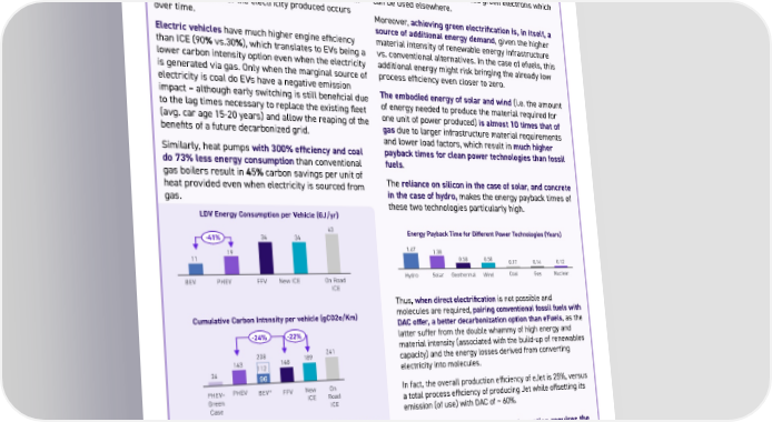 37 BEV PHEV FFV New ICE On Road ICE 11 19 34 34 43 -41% LDV Energy Consumption per Vehicle (GJ/yr) 36 143 96 148 189 241 208 112 BEV* PHEV FFV New ICE On Road ICE PHEV- Green Case -24% -22% Cumulative Carbon Intensity per vehicle (gCO2e/Km) 1.67 1.38 Energy Payback Time for Different Power Technologies (Years) Hydro Solar Geothermal Wind Coal Gas Nuclear 0.58 0.58 0.17 0.14 0.12 LDV Energy Consumption per Vehicle (GJ/yr) 36 143 96 148 189 241 208 112 BEV* PHEV FFV New ICE On Road ICE PHEV- Green Case -24% -22% Cumulative Carbon Intensity per vehicle (gCO2e/Km) 1.67 1.38 Energy Payback Time for Different Power Technologies (Years) Hydro Solar Geothermal Wind Coal Gas Nuclear 0.58 0.58 0.17 0.14 0.12 36 143 96 148 189 241 208 112 BEV* PHEV FFV New ICE On Road ICE PHEV- Green Case -24% -22% 36 143 96 148 189 241 208 112 BEV* PHEV FFV New ICE On Road ICE PHEV- Green Case -24% -22% Cumulative Carbon Intensity per vehicle (gCO2e/Km) Electrification is a key enabler of the energy transformation when it provides efficiency gains, even if decarbonization of the electricity produced occurs over time. Electric vehicles have much higher engine efficiency than ICE (90% vs.30%), which translates to EVs being a lower carbon intensity option even when the electricity is generated via gas. Only when the marginal source of electricity is coal do EVs have a negative emission impact – although early switching is still beneficial due to the lag times necessary to replace the existing fleet (avg. car age 15-20 years) and allow the reaping of the benefits of a future decarbonized grid. Similarly, heat pumps with 300% efficiency and coal do 73% less energy consumption than conventional gas boilers result in 45% carbon savings per unit of heat provided even when electricity is sourced from gas. On the other end of the spectrum, efuels (combining green hydrogen + DAC) while being zero-emission, are incredibly energy inefficient with end-use efficiencies (process + use) below 15%. With the average CO2 intensity of the grid still roughly at par with gas (121 gCO2e/MJ), the energy waste associated with eFuels can be detrimental to the de-carbonization of the Optimizing the Energy system: Energy Efficiency, Carbon & Resource Intensity An efficient energy system transformation requires the whole system to be optimized across energy efficiency, carbon intensity and resource intensity, finding optimal trade-offs for each sector. Achieving a zero-carbon solution at the end user level might still prove a suboptimal solution, if associated with energy waste throughout the production process, or a disproportionate increase in the call on material/ minerals and resources. * Range based on average grid intensity to 100% coal in China. 1.67 1.38 Hydro Solar Geothermal Wind Coal Gas Nuclear 0.58 0.58 0.17 0.14 0.12 BEV PHEV FFV New ICE On Road ICE 11 19 34 34 43 -41% LDV Energy Consumption per Vehicle (GJ/yr) 36 14 PH PHEV- Green Case Cumulative C 1.67 1.38 Energy Payback Time for Different Power Technologies (Years) Box 3: overall system as it cannibalizes green electrons which can be used elsewhere. Moreover, achieving green electrification is, in itself, a source of additional energy demand, given the higher material intensity of renewable energy infrastructure vs. conventional alternatives. In the case of efuels, this additional energy might risk bringing the already low process efficiency even closer to zero. The embodied energy of solar and wind (i.e. the amount of energy needed to produce the material required for one unit of power produced) is almost 10 times that of gas due to larger infrastructure material requirements and lower load factors, which result in much higher payback times for clean power technologies than fossil fuels. The reliance on silicon in the case of solar, and concrete in the case of hydro, makes the energy payback times of these two technologies particularly high. Thus, when direct electrification is not possible and molecules are required, pairing conventional fossil fuels with DAC offer, a better decarbonization option than eFuels, as the latter suffer from the double whammy of high energy and material intensity (associated with the build-up of renewables capacity) and the energy losses derived from converting electricity into molecules. In fact, the overall production efficiency of eJet is 25%, versus a total process efficiency of producing Jet while offsetting its emission (of use) with DAC of ~ 60%.