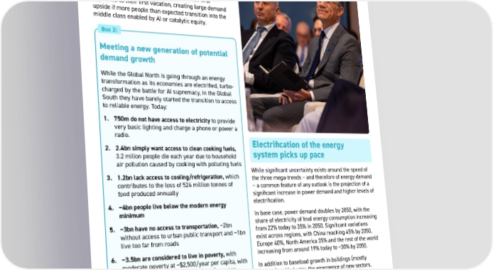 20 While significant uncertainty exists around the speed of the three mega-trends – and therefore of energy demand – a common feature of any outlook is the projection of a significant increase in power demand and higher levels of electrification. In base case, power demand doubles by 2050, with the share of electricity of final energy consumption increasing from 22% today to 35% in 2050. Significant variations exist across regions, with China reaching 45% by 2050, Europe 40%, North America 35% and the rest of the world increasing from around 19% today to ~30% by 2050. In addition to baseload growth in buildings (mostly cooling) and industry, the emergence of new sectors, such as AI, transport and low carbon markets, adds significantly to the demand for electricity, with these new sectors combined accounting for more than 30% of incremental power demand by 2050. In a case characterized by fast progression across all three megatrends, power demand could quadruple by 2050. See Fig. 7 Electrification of the energy system picks up pace Meeting the growing demand for energy in uncertain times Meeting a new generation of potential demand growth While the Global North is going through an energy transformation as its economies are electrified, turbo- charged by the battle for AI supremacy, in the Global South they have barely started the transition to access to reliable energy. Today: 1. 750m do not have access to electricity to provide very basic lighting and charge a phone or power a radio. 2. 2.4bn simply want access to clean cooking fuels, 3.2 milion people die each year due to household air pollution caused by cooking with polluting fuels 3. 1.2bn lack access to cooling/refrigeration, which contributes to the loss of 526 million tonnes of food produced annually 4. ~4bn people live below the modern energy minimum 5. ~3bn have no access to transportation, ~2bn without access to urban public transport and ~1bn live too far from roads 6. ~3.5bn are considered to live in poverty, with moderate poverty at ~$2,500/year per capita, with ~700m in extreme poverty at ~$785/year per capita, (compared with ~$65,000/year per capita in the US) Box 2: How quickly the Global South can move through the wealth ladder is a key uncertainty in the outlook given that the region will represents 70% of the global population by 2050 while accounting for less than 30% of energy demand today. Energy consumption per capita rises quickly as households progressively move towards more energy-intensive lifestyles, from their first appliance to their first vacation, creating large demand upside if more people than expected transition into the middle class enabled by AI or catalytic equity. Source: World Bank, ExxonMobil, WHO, Refrigeration World News