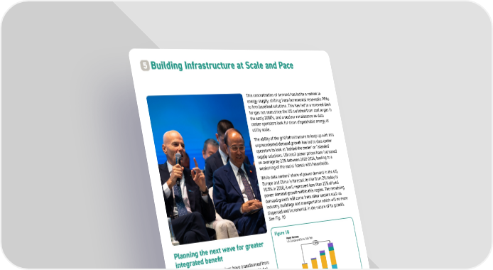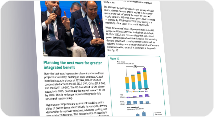 24 Over the last year, hyperscalers have transformed from projection to reality, building at scale and pace. Global installed capacity stands at 122 GW, 80% of which is concentrated around the US (53.7 GW), China (31.9 GW), and the EU (11.9 GW). The US has added 12 GW of new capacity in 2025, positioning the market to reach 98 GW by 2030. This is no longer incremental growth—it is structural hyperscaling. Hyperscale campuses are equivalent to adding entire cities of power demand exclusively for compute, driving demand for firm power solutions, advanced cooling, and new grid architectures. This concentration of capacity is forcing utilities and governments to rethink grid planning, permitting, and energy procurement strategies. The scale is unprecedented. Meta’s Hyperion campus will scale to 5 GW by 2030, supporting AI workloads at unprecedented density, while OpenAI’s Stargate project is targeting 26 GW across five US sites—comparable to the entire power demand of Greece. Building Infrastructure at Scale and Pace 5 Planning the next wave for greater integrated benefit This concentration of demand has led to a rethink in energy supply, shifting from incremental renewable PPAs to firm baseload solutions. This has led to a renewed dash for gas not seen since the US switched from coal to gas in the early 2000’s, and a nuclear renaissance as data center operators look for clean dispatchable energy at utility scale. The ability of the grid infrastructure to keep up with this unprecedented demand growth has led to data center operators to look at ‘behind the meter’ or ‘islanded’ supply solutions. US retail power prices have increased on average by 23% between 2020-2024, leading to a weakening of the social licence with households. While data centers’ share of power demand in the US, Europe and China is forecast to rise from 2% today to 10.5% in 2050, it will represent less than 25% of total power demand growth within this region. The remaining demand growth will come from other sectors such as industry, buildings and transportation which will be more dispersed and incremental in the nature of its growth. See Fig. 10 Figure 10 DC % of Total Power Generation 2024 2030 2040 2050 +73% DC Transport Buildings Industry 1.8% 4.1% 7.6% 10.5% Gas % of Total Power Generation 13.9% 13.6% 11.8% 8.6% Power Demand US, Europe and China, ‘000 TWh Drivers of develop Current USD (tm) Power Demand Growth US, Europe and China, ‘000 TWh 200 180 160 140 120 100 80 60 40 20 0 16 LICs* (today) *LICs E Concentrated Power Demand Dispersed, Incremental Power Demand 2025-2030 2030-2040 2040-2050 Others Data Centers 2.6 16% 82% 22% 25% 78% 75% 0.6 3.1 3.8 3.9 1.1 1.3 4.9 5.3 Power Demand Growth US, Europe and China, ‘000 TWh