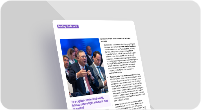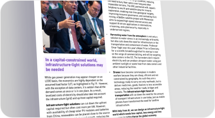 42 While gas power generation may appear cheaper on an LCOE basis, the economics are highly dependent on the assumed load factor (LF), as highlighted in Fig 19. However, with the exception of data centers, it is seldom that all the demand comes at once or is in one place. As a result, levelized costs of electricity should also take into account the infrastructure (grid) and up-front capital required. Infrastructure-light solutions can cut down the upfront capital required but often cost more per kW. However, with availability of cheap solar PV modules and batteries from China, renewables can be placed close to the source of demand and scaled with demand growth, reducing the upfront capital and the need for expensive infrastructure, with the benefit of limiting running costs. With planning, the strategic deployment of infrastructure- light distributed energy systems could significantly reduce the cost of access to energy and, with innovative financing such as enterprise-backed credit obligations for future capacity (ECO capacity) or catalytic equity to seed economic development (such as from Alterra), could unlock huge economic potential. Infrastructure-light solutions should not be limited to energy: • Digital access is often constrained by connectivity and latency to data centers. Low-orbit satellite broadband can cut down latency over large distances, reducing the need to bury fiber optics over long and often impassible terrains. The DRC partnered with Japan’s Solafune to use AI and satellite data for mineral exploration, enabling real-time geological insights, improving resource governance, and combating illicit mining. A $400m satellite project with Monacosat aims to expand high-speed internet access and support AI-driven applications in telemedicine, e-learning, and cybersecurity, especially in underserved regions. • Harvesting water from the atmosphere is not only a solution to water stress in an increasingly arid world, but also cuts down the need for infrastructure or the transportation and containment of water. Professor Omar Yaghi won this year’s Nobel Prize in Chemistry for a scientific breakthrough that his startup is now on the verge of commercializing, and will be targeting data centers in the US. The harvesters don’t require electricity and can produce ultrapure water using just ambient sunlight or waste heat from data centers and other industrial facilities. • Drones have become commonplace in modern warfare because they are cheap, efficient and not constrained by geography. As such they are a technology ready to carry not only warheads, but to deliver medicines, goods, food etc to less accessible areas, reducing the need for roads, bridges and tunnels. The infrastructure-light future of transportation will cut down the need for the amount of transport infrastructure in use today, just as mobile phones have transformed the need for landline infrastructure. With help from AI, we can design an infrastructure-light world which needs less capital, less energy and less resources to turbo-charge the global economy. In a capital-constrained world, infrastructure-light solutions may be needed Unattributed quote Funding the Growth The governments that move first to signal demand — for turbines, for grid upgrades, for gas plants — will win. AI can transform the physical world, but only if we send the right demand signals to industry now.