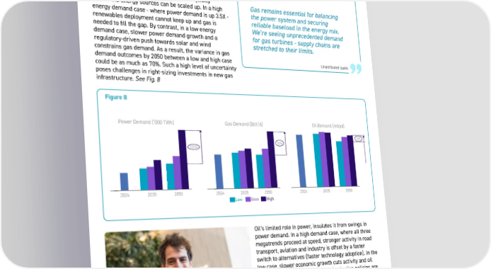 22 22 While building and industry are important drivers of gas demand, by far the largest uncertainty for gas is the extent of growth in power loads and how quickly renewable energy sources can be scaled up. In a high energy demand case - where power demand is up 3.5X - renewables deployment cannot keep up and gas is needed to fill the gap. By contrast, in a low energy demand case, slower power demand growth and a regulatory-driven push towards solar and wind constrains gas demand. As a result, the variance in gas demand outcomes by 2050 between a low and high case could be as much as 70%. Such a high level of uncertainty poses challenges in right-sizing investments in new gas infrastructure. See Fig. 8 Oil’s limited role in power, insulates it from swings in power demand. In a high demand case, where all three megatrends proceed at speed, stronger activity in road transport, aviation and industry is offset by a faster switch to alternatives (faster technology adoption). In the low case, slower economic growth cuts activity and oil demand, but in this pathway decarbonization policies are more likely to also adjust to economic realities, resulting in a slower shift. Consequently, the range of oil demand outcomes is narrower than for power or gas, yet new exploration and production will still need to keep up with increasing decline rates, requiring around 4-7mbd of new production to come online every year. Gas balances the power system Figure 8 Unattributed quote Meeting the growing demand for energy in uncertain times 131% 2024 2035 2050 72% 2024 2035 2050 14% 2024 2035 2050 Low Base High Power Demand (’000 TWh) Gas Demand (Bcf/d) Oil Demand (mbpd) Gas remains essential for balancing the power system and securing reliable baseload in the energy mix. We’re seeing unprecedented demand for gas turbines - supply chains are stretched to their limits.