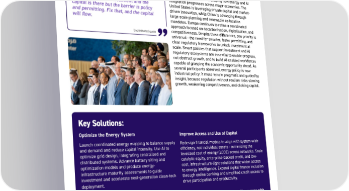 11 Key Solutions: Optimize the Energy System Launch coordinated energy mapping to balance supply and demand and reduce capital intensity. Use AI to optimize grid design, integrating centralized and distributed systems. Advance battery siting and optimization models and produce energy- infrastructure maturity assessments to guide investment and accelerate next-generation clean-tech deployment. Maximize the Value of Data Center Siting Define new siting archetypes beyond the US and China, aligned with energy availability and community benefits. Develop data partnerships to address data- sovereignty barriers and promote shared infrastructure standards for efficiency and carbon accounting. Embed community integration and demand-side management tools and establish regional tech-maturity and talent scores to attract investment. Different policy models are shaping how energy and AI integration progresses across major economies. The United States is leveraging private capital and market- driven innovation, while China is advancing through large-scale planning and renewable co-location mandates. Europe continues to refine a coordinated approach focused on decarbonisation, digitalisation, and competitiveness. Despite these differences, one priority is universal - the need for smarter, faster permitting, and clear regulatory frameworks to unlock investment at scale. Smart policies that support investment and AI regulatory ecosystems are essential to enable progress, not obstruct growth, and to build AI-enabled workforces capable of grasping the economic opportunity ahead. As several participants observed, energy policy is now industrial policy: it must remain pragmatic and guided by insight, because regulation without realism risks slowing growth, weakening competitiveness, and choking capital. Improve Access and Use of Capital Redesign financial models to align with system-wide efficiency, not individual assets - minimizing the levelized cost of energy (LCOE) across networks. Scale catalytic equity, enterprise-backed credit, and low- cost, infrastructure-light solutions that widen access to energy intelligence. Expand digital finance inclusion through online banking and simplified credit access to drive participation and productivity. Ultimately the cost of Intelligence will converge with the cost of energy. The Majlis consensus: energy abundance is the precondition for AI abundance; align policy, capital and talent now to deliver both at scale and pace, seizing this next economic wave of growth brought by the Intelligence Age. and satellite broadband as practical leapfrogs, while warning that grid reconductoring and interconnects are essential to avoid curtailment and stranded renewables. We need massive investment and the capital is there but the barrier is policy and permitting. Fix that, and the capital will flow. Unattributed quote 6. Policy and Talent are key to developing an ecosystem attractive to investment and growth