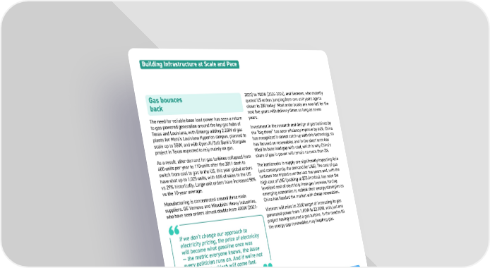 26 Unattributed quote The need for reliable base load power has seen a return to gas-powered generation around the key gas hubs of Texas and Louisiana, with Entergy adding 2.2GW of gas plants for Meta’s Louisiana Hyperion campus, planned to scale up to 5GW, and with Open AI/Soft Bank’s Stargate project in Texas expected to rely mainly on gas. As a result, after demand for gas turbines collapsed from 400 units per year to 110 units after the 2011 dash to switch from coal to gas in the US, this year global orders have shot up to 1,025 units, with 46% of sales to the US vs 29% historically. Large unit orders have increased 50% vs the 10-year average. Manufacturing is concentrated around three main suppliers. GE Vernova and Mitsubishi Heavy Industries, who have seen orders almost double from 40GW (2021- Gas bounces back 2023) to 70GW (2024-2026), and Siemens, who recently quoted US orders jumping from one unit years ago to closer to 200 today! Most order books are now full for the next five years with delivery times as long as seven years. Investment in the research and design of gas turbines by the “big three” has seen efficiency improve by 64%. China has recognized it cannot catch up with this technology, so has focused on renewables and in the short term has filled its base load gap with coal, which is why China’s share of gas in power will remain no more than 3%. The bottlenecks in supply are significantly impacting Asia (and consequently the demand for LNG). The cost of gas turbines has tripled over the last few years and, with the high cost of LNG (peaking at $75/mmbtu), has seen the levelized cost of electricity from gas increase, forcing emerging economies to rethink their energy strategies as China has flooded the market with cheap renewables. Vietnam will miss its 2030 target of increasing its gas generated power from 1.6GW to 22.3GW, with just one project having secured a gas turbine. In the need to fill the energy gap renewables may leapfrog gas. Building Infrastructure at Scale and Pace If we don’t change our approach to electricity pricing, the price of electricity will become what gasoline once was — the metric everyone knows, the issue every politician runs on. And if we’re not careful, that backlash will come fast.