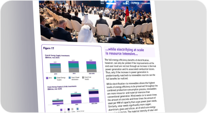 39 ...while electrifying at scale is resource intensive... The full energy efficiency benefits of electrification, however, can only be yielded if the improvements at the end-user level are not lost through an increase in thermal power generation and its associated combustion losses. Thus, only if the increase in power generation is predominantly matched via renewables sources can the full benefits be realized. While electrification via renewables allows the highest levels of energy efficiency to be preserved throughout the combined production-consumption process, renewables are more resource- and material-intensive than conventional generation. Wind needs six to seven times the amount of concrete and three times the amount of steel per MW of capacity than a gas power plant needs. Similarly, solar needs significantly more copper, aluminium, glass and silicon, all of which are energy- intensive materials. The material intensity of solar and wind is then amplified by their lower load factor. For utility-scale solar, load factors tend to vary between 15% and 25%. This means that, to generate the same amount of electricity generated by 1 MW of gas capacity, you will need an average of 2-4 MW of solar capacity. This can be significantly improved with the use of batteries, but doing that adds an additional call on upfront capital and resources. See Fig. 18 The ratione of undergoing these heavy upfront capital investments lies in the significant energy efficiency benefits that electrification yields at the end-user level, See Call Out Box 3. Electric vehicles are three times more efficient than ICEs, and heat pumps are 300% more energy efficient than conventional gas boilers. Grid Clean Energy Supply Fossil Power Generation Fossil Fuel Supply 2,500 2,471 2,021 2015 2024 2025-2050 Overall Energy Supply Investments ($Billion, real 2025) Grid 1,700 2015 2024 Clean Energy Supply & Grids Investments ($Billion, real 2025) 1,325 555 2025-2050 Battery Storage Solar Wind Nuclear Figure 17