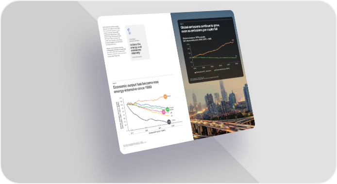 More recently, primary energy demand has begun to decouple from economic growth in more mature markets. Global GDP has almost tripled since 1990, while energy intensity has fallen 34% (see Figure 2), driven by a shift from industry to services, as well as steady improvements in energy efficiency. Related, the emissions intensity of the global economy has declined by c. 60% since 1970, even whilst absolute emissions have continued to grow (see Figure 3). 1990 2000 2010 2019 China Brazil France UK US World 40 60 80 100 120 50 70 90 110 0 Global GDP (in 2017 $PPP) Energy intensity per unit of GDP (indexed to 1990 = 100, in $PPP) 51T 68T 97T 130T +5% +34% +43% +72% Economic output has become less energy-intensive since 1990 Figure 2 Global emissions continue to grow, even as emissions per capita fall Figure 3 Note: PPP = purchasing power parity; T = trillion Source: BCG, A Blueprint for the Energy Transition, 2023. Global emissions 1970 onwards [All values indexed to 1970 (1970 = 100)] Global annual CO2 emissions Global emissions per GDP $ 42 249 0 250 50 150 200 100 1980 1990 1970 2010 2020 2000 All values indexed to 1970 (1970 = 100). Source: Global Carbon Budget (2023) – with major processing by Our World in Data reduce the energy and emissions intensity Technological innovation has helped of economic output 16 Powering Possible 15