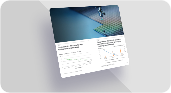 Figure 19 Energy intensity of AI computer chips has been improving historically 1000 100 10 1 0.1 2022 2020 2018 2016 2014 2012 2010 2008 Energy intensity Index of energy intensity of Al computer chips (2008-100, log scale) Chip model release date Source: IEA, What the data center and AI boom could mean for the energy sector, October 2024 Figure 20 Energy intensity of compute is decreasing even as energy consumption of AI chips is increasing on a per unit basis 7 10 14 1.30 0.32 0.20 0.0 0.5 1.0 1.5 0 5 10 15 20 Max Power (kW) Energy intensity of compute (kW/pFLOPs) DGX A100 DGX H100 DGX B200 More advanced GPU generations Max Power (kW) Energy intensity of compute (kW/pFLOPs) Source: Nvidia, DGX Station A100 Hardware Specifications; Nvidia, H100 Tensor Core GPU Datasheet; Nvidia, DGX B200 Datasheet; ADNOC Analysis. 74 Powering Possible 73