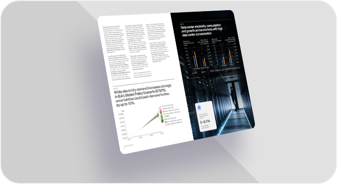 Data center electricity demand is expected to account for of U.S. electricty demand by 2030 130 5 – 9.1% Reliably forecasting AI electricity demand beyond a few years is extremely difficult.127 It will depend on how AI models are developed and operated, how technologies advance, and how models evolve. Innovations will be critical to increase energy efficiency in data center design and operations. But according to IEA projections, data centers will remain a relatively small driver of overall electricity demand growth at the global level in the decade to come (see Figure 21). In certain regions, the speed and scale of AI and data center growth has the potential to put more pressure on local electric supplies due to rapid connection requirements that outpace historic planning timelines. The high demand for reliable carbon- free power further intensifies these challenges, requiring careful coordination and strategic planning to ensure that both AI and data centers can effectively integrate into the evolving energy landscape. Figure 22 Data center electricity consumption and growth across markets with high data center concentration For example, in regions where data centers are concentrated, they can account for a significant percentage of the total electricity demand load (see Figure 22). In the EU, electricity demand for data centers is expected to increase at ~9% per year due to digitalization, including AI, and could exceed 5% of the EU electricity demand by 2026. In the U.S.—the largest data center market globally—data centers represent about 4% of the nation’s electricity demand; that is expected to rise to nearly 6% by 2026.128 These rates of growth can be challenging in regions with aging transmission infrastructure and growing competing demands for carbon-free generation. In certain markets, that growth will potentially translate into a large share of grid demand. In the U.S., electricity demand has stayed relatively flat since the turn of the century but is now expected to grow at 1–2% per year, resulting in an overall increase of 15–20% from 2023 to 2030.129 According to the Electric Power Research Institute (EPRI), data center electricity demand is expected to grow 5–15% annually and can potentially account for 5.0–9.1% of U.S. electricity demand by 2030, up from nearly 4% in 2022.130 Power producers and technology companies are building generation capacity in response. American Electric Power is adding 20 GW over the next decade, 15 GW of which is to meet demand from data centers.131 Technology companies are partnering in building capacity with utilities—for example, in Nevada with advanced geothermal and in Virginia with SMR.132 2022 2026 Share of total data center demand in the region (right axis) European Union United States 5% 6% 4% 3% 2% 0% 1% Data center electricity demand (TWh) Share of total data center demand in the region (%) 275 330 220 165 110 0 55 Ireland Denmark 35% 42% 28% 21% 14% 0% 7% 15 18 12 9 6 0 3 Data center electricity demand (TWh) Share of total data center demand in the region (%) Source: IEA, Electricity 2024. Figure 21 While electricity demand increases strongly in IEA’s Stated Policy Scenario (STEPS), uncertainties could push demand further, by up to 15%. 36,000 40,000 44,000 TWh 20,000 28,000 32,000 24,000 2 3 4 6 5 7 8 More heat waves Faster EV growth Faster data centre growth Lower appliance efficiency STEPS Slower EV growth Slower data centre growth Higher appliance efficiency 1 2023 2030 2015 2035 Source: IEA, WEO 2024 76 Powering Possible 75