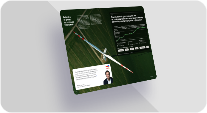Role of AI in green- technology innovation Figure 12 Several technologies must climb the technological readiness curve toward maturity before they can be deployed at a global scale Continued innovation will be needed to develop and commercialize new technologies and eliminate the “green premium,” which is the cost difference between legacy carbon-intensive and newer, low-carbon technologies. New technologies that are not yet at scale will account for 35% of the emissions reductions needed to achieve net zero by 2050.65 Bringing these technologies to scale is achievable but will require concerted effort. Innovation stage Demonstration (TRL = 7 or 8) Prototype (TRL < 6) Early adoption (TRL = 9 or 10) Maturity (TRL = 11) Technology readiness level (TRL) TRL is determined during an assessment that examines program concepts, technology requirements, and demonstrated technology capabilities. TRLs are calculated on a scale from 1 (least mature) to 11 (most mature) Low-carbon hydrogen and synfuels Bioenergy Energy storage Carbon removal (incl. DAC) Green factory technologies Distributed energy Key challenges to technological maturity include: Funding End-system integration Supply chain Talent sourcing Factory setup Product development Patrick Pouyanné Chairman and CEO, TotalEnergies “ Electricity and renewable energies are digital ready: AI enables us to accelerate and optimize their integration along the entire electricity chain. AI technology will play a key role in the transition to a net-zero energy system!” The IEA has highlighted hydrogen electrolyzers, direct air capture (DAC), and next-generation batteries as three of the most critical innovations along the path to net zero.66 However, these innovations, along with other nascent technologies, face a steep climb to technological maturity, reducing costs, and scalability (see Figure 12). Source: BCG, Fast-Tracking Green Tech: It Takes an Ecosystem, 2023. 40 Powering Possible 39
