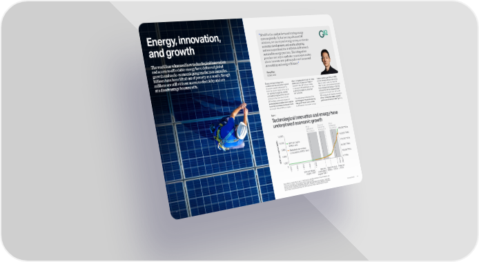 Energy and technology have underpinned two centuries of global economic growth and prosperity. From the steam engine of the early 19th century through the internal combustion engine of the mid-20th century to the internet of the late 20th century, successive waves of technological innovation have enabled humanity to produce more output with less input. Global GDP per capita— after a long stagnation that may have lasted many thousands of years— took off in the 19th century. Today, it has reached $13,000 per person, a 13-fold increase in a little over two centuries. The widespread adoption of the technological innovations driving that growth relied upon access to affordable and reliable energy Technological innovation and energy have underpinned economic growth Figure 1 in ever-greater quantities. In 1800, primary energy demand was 6,250 TWh per year; today, it is 180,000 TWh.24 It was technological innovation that unlocked that energy—from the introduction of coal-powered steam engines in the coal mines of the late 18th century to the fracking revolution of the 1990s. It has been a cycle of positive reinforcement (see Figure 1). Peng Xiao GCEO, G42 “ AI will be the catalyst for transforming energy systems globally. By harnessing advanced AI solutions, we can expand energy access, accelerate economic development, and enable adopting nations to spearhead the worldwide shift toward sustainable energy practices. This integration promises not only to optimize current systems but also to innovate new pathways for environmental stewardship and energy efficiency.” Efficient Steam engine 1769 Internal combustion engine 1867 Electrification 1890s – 1930s 0 1,000 4,000 7,000 10,000 13,000 1200 1400 1600 1800 1000 2000 20231 0 TWhs 40,000 TWhs 80,000 TWhs 120,000 TWhs 160,000 TWhs 200,000 TWhs GDP per capita (LHS y-axis) GDP per capita (USD) First Industrial Revolution Second Industrial Revolution Third Industrial Revolution Internet 1970s Global primary energy consumption (RHS y-axis) Energy, innovation, and growth The world has witnessed how technological innovation and access to affordable energy have delivered global growth and socio-economic progress for two centuries. Billions have been lifted out of poverty as a result, though millions are still without access to electricity and are at a disadvantage because of it. Note: GDP per capita data for year 0 – 1980 based on data from Maddison Project Database and University of Gronigen; 1980-present based on data from IMF Source: Our World in Data, World Bank, “World Bank World Development Indicators”, 2023; Bolt and van Zanden - Maddison Project Database 2023, University of Gronigen; Maddison Database 2010; Oxford Economics (GDP data from IMF Data Portal-1980 onwards); ADNOC Analysis 14 Powering Possible 13