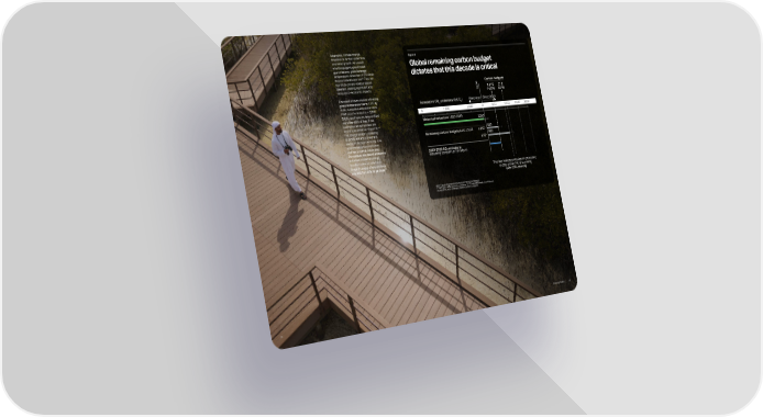 Meanwhile, climate change threatens to further undermine economic growth. As a result of anthropogenic greenhouse gas emissions, global average temperatures have risen 1.2°C since the pre-industrial period.33 This rise has led to climate-related natural disasters causing significant and rising socio-economic impacts. If we want an even chance of limiting global temperature rise to 1.5°C by 2100, cumulative emissions since 1850 must be limited to c. 2,900 GtCO2; as of now, we have emitted more than 80% of that. If not controlled, we will exhaust the rest of it by 2030 (see Figure 5).34 The energy system, consisting of producers and consumers, accounts for approximately 75% of greenhouse gas emissions and has a central role to play. For context, this rate of emissions reduction implies an energy transformation roughly three times the speed of any previous one, and from a far larger base.35 Figure 5 Global remaining carbon budget dictates that this decade is critical 2390 2000 Historical Since 2020 2020 Historical emissions 1850-2019 Remaining carbon budgets (until 2100) 2020-2030 CO2 emissions assuming constant at 2019 level 1.5°C1 2°C2 (>50%) (83%) Carbon budgets 0 1000 2000 0 1000 500 1500 500 900 Cumulative CO2 emissions (GtCO2) 1.5° C 2° C This line indicates maximum emissions to stay within 2°C of warming (with 83% chance) Note: Figures in parentheses denote level of confidence; 1. 1.5°C with >50% level of confidence; 2. 2°C with 83% level of confidence Source: IPCC AR6 Synthesis Report; ADNOC Analysis 22 Powering Possible 21