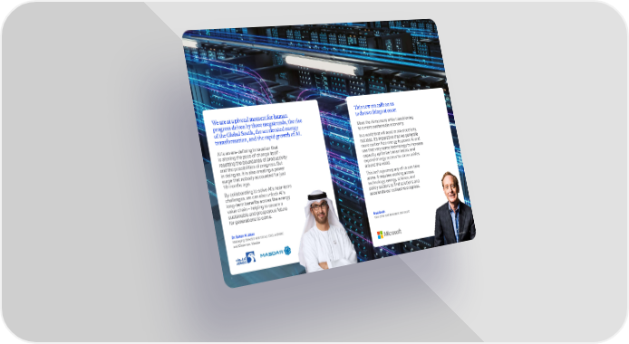 We are at a pivotal moment for human progress driven by three megatrends, the rise of the Global South, the accelerated energy transformation, and the rapid growth of AI. AI is an era-defining innovation that is altering the pace of change itself - resetting the boundaries of productivity and the possibilities of progress. But in doing so, it is also creating a power surge that nobody accounted for just 18 months ago. By collaborating to solve AI’s near-term challenges, we can also unlock AI’s long-term benefits across the energy value chain – helping to secure a sustainable and prosperous future for generations to come. This new era calls on us to do two things at once: Meet the AI moment while transitioning to a more sustainable economy. In a world that will need more electricity, not less, it's imperative that we generate more carbon free energy to power AI and use that very same technology to increase capacity, optimize transmission, and expand energy access to communities around the world. This isn’t a journey any of us can take alone. It requires working across technology, energy, science, and policy sectors to find solutions and accelerate our collective progress. Dr. Sultan Al Jaber Managing Director and Group CEO, ADNOC and Chairman, Masdar Brad Smith Vice Chair and President, Microsoft 4 Powering Possible 3