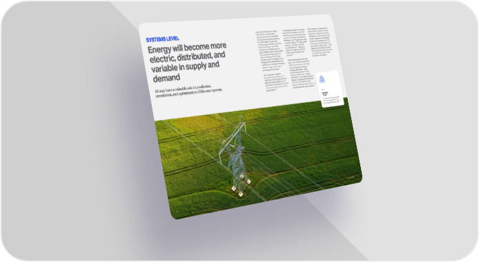 Energy will become more electric, distributed, and variable in supply and demand Electricity will be the core energy vector of the net-zero system, accounting for approximately 50% of total energy demand by 2050, up from 20% today.73 However, the primary energy mix behind electricity must diversify, with nearly 90% coming from renewable sources.74 Seven different energy sources (solar, wind, solid bioenergy, nuclear, oil, hydro, natural gas with CCS) will provide at least 20 exajoules (EJ) of energy each, compared with six (oil, unabated coal, unabated natural gas, solid bioenergy, nuclear, hydro) providing that level today.75 With the uptake of weather- dependent energy sources, the variability of energy generation will significantly grow. Nearly 70% of global electricity generation in 2050 is expected to come from variable solar and wind.76 SYSTEMS LEVEL The geographic dispersion of energy generation will increase as well, and distributed power generation will play a major role. The IEA estimates that distributed solar PV generation could increase more than 20 times by 2050, going from 320 TWh in 2020 to around 7,500 TWh.77 That would account for roughly one-third of today’s total global electricity demand.78 With the introduction of two-way power flows, distributed generation will have implications for the shape of the energy system. In some instances, bulk power—large, centralized generators—may be augmented with smaller, variable generators.79 In the residential sector, the source of power will primarily be solar PV. In the industrial sector, sources will include solar PV, wind, and combined heat and power systems.80 Energy systems and regulation will need to evolve to support two-way power flows. Already today, leading distribution networks, such as those in South Australia and Queensland, are becoming net exporters to the energy system because of the high penetration of rooftop solar.81 These systems have introduced dynamic operating envelopes to ensure they can maintain grid stability while maximizing solar output. AI may have a valuable role in prediction, simulation, and optimization of this new system. Nearly of global electricity generation in 2050 is expected to come from variable solar and wind 76 70% 50 Powering Possible 49