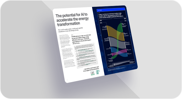 SURVEY INSIGHT The potential for AI to accelerate the energy transformation Last year in Dubai, UAE, world leaders aligned on the pathway to decarbonizing the current energy system and building a system for the future. The COP28 UAE Consensus requires, amongst other things, tripling renewable energy capacity and doubling the rate of energy efficiency by 2030, as well as accelerating the deployment of new carbon-free technologies (see Figure 6). AI’s emergent abilities could make a significant contribution to delivering on these challenging but critical commitments. According to the ADNOC global survey, more than 90% of business leaders believe AI will have a transformational impact on the energy transformation by 2030, and even more believe it will by 2050 (see Figure 7). AI could play a significant role both in decarbonizing the current energy system and building the energy system of the future. 82% of leaders from the same survey believe AI can increase the speed at which energy companies become more sustainable. Figure 7 Leaders’ confidence in AI driving innovative energy breakthroughs for emerging energy solutions like carbon capture and SMRs quadruples in the long term Figure 6 COP28 delivered major commitments across renewable energy, energy efficiency, and more — laying the groundwork for the net-zero system of the future… The world requires a just, orderly, and equitable transition to a net-zero energy system. Note:1% of respondents responded 'Don't know' are included; Source: ADNOC AI Survey; Respondents were asked in which area of energy production do they feel artificial intelligence (AI) will have the most transformational impact by 2030 and by 2050. … but bold commitments need to be supported by bold action. 92% 2050 2030 28. Further recognizes the need for deep, rapid and sustained reductions in greenhouse gas emissions in line with 1.5 °C pathways and calls on Parties to contribute to the following global efforts, in a nationally determined manner, taking into account the Paris Agreement and their different national circumstances, pathways and approaches: (a) Tripling renewable energy capacity globally and doubling the global average annual rate of energy efficiency improvements by 2030; (b) Accelerating efforts towards the phase-down of unabated coal power; (c) Accelerating efforts globally towards net zero emission energy systems. utilizing zero- and low-carbon fuels well before or by around mid-century; (d) Transitioning away from fossil fuels in energy systems, in a just, orderly and equitable manner, accelerating action in this critical decade, so as to achieve net zero by 2050 in keeping with the science; (e) Accelerating zero- and low-emission technologies, including, inter alia, renewables, nuclear, abatement and removal technologies such as carbon capture and utilization and storage, particularly in hard-to-abate sectors, and low-carbon hydrogen production; (f) Accelerating and substantially reducing non-carbon-dioxide emissions globally, including in particular methane emissions by 2030; (g) Accelerating the reduction of emissions from road transport on a range of pathways, including through development of infrastructure and rapid deployment of zero-and low-emission vehicles; (h) Phasing out inefficient fossil fuel subsidies that do not address energy poverty or just transitions, as soon as possible; 10% Traditional oil & gas 11% Renewable energy 28% Emerging energy solutions (e.g., carbon capture,biofuels, small modular nuclear reactors (SMRs), etc.) 8% AI will not have a transformational impact in this time period1 9% Traditional oil & gas 16% Renewable energy 28% Energy distribution (distributing energy more effectively, lessening cost/environmental impact) 32% Optimizing energy efficiency (creating more energy with less environmental impact) 19% Energy distribution (distributing energy more effectively, lessening cost/environmental impact) 26% Optimizing energy efficiency (creating more energy with less environmental impact) 7% Emerging energy solutions (e.g., carbon capture,biofuels, small modular nuclear reactors (SMRs), etc.) 3% AI will not have a transformational impact in this time period1 97% 92% 28 Powering Possible 27