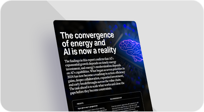 INSIGHTS RECOMMENDATION Hype gives way to pragmatism: The initial excitement around AI is maturing. While investment is still high, fewer businesses now call AI their "top priority". The focus has shifted from potential to the practical realities and challenges of integration, with many organizations looking to move from pilot to production Prioritize scalable, operational AI deployments with clear business value. Energy companies should shift resources from exploratory pilots to full-scale, production-ready AI solutions that directly address operational pain points (e.g., predictive maintenance, grid optimization). Establish robust frameworks for evaluating ROI and lessons learned from pilots and invest in change management to accelerate adoption across business units. Consider all perspectives to avoid misalignment on AI’s Impact: While most respondents continue to see AI’s impact on the energy sector as in line with other sectors – with numbers remaining relatively flat year on year, the gap between senior leaders and business decision makers is telling. 52% of BDMs see AI’s disruption on energy as being greater than other industries while it’s just 28% for the leaders. Bridge the perception gap through cross-level engagement and shared goals. Facilitate regular forums and workshops where senior leaders and business decision makers jointly review AI progress, challenges, and opportunities. Align incentives and performance metrics to ensure both groups are invested in AI-driven transformation, fostering a unified vision and accelerating buy-in at all levels. When senior leaders are seen using AI and investing in their own digital literacy, it sends a powerful message: AI is everyone’s business. The convergence of energy and AI is now a reality The findings in this report confirm that AI’s exponential growth depends on timely energy investment, and energy’s modernization depends on AI’s capabilities. What began as seven priorities in 2024 has now become a roadmap in action: efficiency gains, deeper collaboration, expanded investment, and early breakthroughs across the value chain. The task ahead is to scale what works and close the gaps before they become constraints. 38