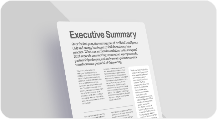This shift is reflected in the findings of the 2025 study by ADNOC, which shows that AI and digital infrastructure investment continues to climb with nearly nine in ten respondents reporting increased spending over the past year. The goal is no longer about proving concepts but how to move from pilot to enterprise-scale production while ensuring that AI and energy advance in parallel in ways that are sustainable, reliable, and inclusive. Executive Summary Over the last year, the convergence of Artificial Intelligence (AI) and energy has begun to shift from theory into practice. What was surfaced as ambition in the inaugural 2024 report is now moving to execution as projects scale, partnerships deepen, and early results point toward the transformative potential of this pairing. Adoption patterns vary by seniority and region: Decision makers closer to implementation report broader functional use than their executive counterparts. Optimism is strongest in China and India. At the same time, barriers to AI deployment in the energy sector are shifting, with cybersecurity now seen as the top concern, closely followed by data quality. This suggests that energy leaders arent questioning AIs value anymore theyre wrestling with how to make it work. Last years inaugural Powering Possible report outlined seven priorities to help the industry to overcome these barriers and accelerate AI deployments at scale. This years edition tracks progress against each, highlighting where value is already being realized, where blockers remain, and what actions can deliver impact at scale. The result is a practical playbook for industry leaders navigating the AIenergy nexusshowing what works, where urgency is greatest, and how collaboration can unlock both commercial and climate benefits. Strategic partnershipssuch as those between ADNOC and Microsoftshow how collaboratively developed solutions can simultaneously meet AIs growing energy needs and apply AI to optimize energy operations. These alliances are no longer experiments; they are being scaled across enterprises and sectors, setting a blueprint for broader adoption. Investment is following suit, flowing into renewable expansion, grid resilience, methane reduction, and carbon capture, utilization and storage. Pilot projects are giving way to full-scale deployments with measurable operational savings and emissions reductions. Yet financing still lags the scale of demand, particularly as next-generation AI data centers emerge as energy- intensive complexes requiring up to 5 GW of continuous power. Meeting this challenge requires not just more capital but smarter, faster infrastructure planning and permitting. Under the UAE's leadership, Artificial Intelligence stands today as a defining force of national progress and a cornerstone of our future readiness. The UAE recognizes that those who lead in AI will shape the future of economies, societies, and humanity itself. AI is already transforming how we work, make decisions, and address complex challenges, faster, smarter, and at scale. Yet, the true measure of leadership lies not only in technological advancement, but in preparing talents to harness its full potential. The UAE is deeply committed to developing human capital, empowering people with AI skills, knowledge, and mindset to innovate and lead in the age of AI. H.E. Omar Sultan Al Olama Minister of State for Artificial Intelligence, Digital Economy, and Remote Work Applications UAE 7 Powering Possible 2025