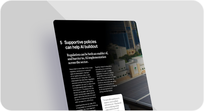 Respondents noted that while a loose regulatory landscape encourages rapid AI development, the lack of comprehensive policy could hinder long-term progress. This emphasizes the need for a regulatory environment that integrates policy and regulation across the value chain to ensure sustainable AI usage in the long term. This aligns with the survey participants' call for policy modernization and responsible AI governance frameworks to ensure AI use in critical energy systems is safe, transparent, and ethical. Looking at the survey data, 34% of respondents consider AI-energy regulation the most important policy action, followed by grid investment (27%), incentives for clean energy (25%), and digital skills programs (14%). This highlights how regulatory mismatches can stall AI projects and explains why some governments are taking steps to address these gaps through initiatives like regulatory sandboxes and data- transparency rules. The emphasis on grid investment and clean energy incentives also aligns with the broader need for a balanced regulatory approach that supports innovation while ensuring long- term sustainability. Together, these findings tell a compelling story about the necessity of a well-rounded regulatory framework to foster the growth of AI in the energy sector. They emphasize the need for a harmonious approach to AI ethics, responsible use policy, and environmental policy to create a environment conducive for AI development and energy transformation. 5 Supportive policies can help AI buildout Regulation can be both an enabler of, and barrier to, AI implementation across the sector. AI now offers pathways to smarter, more resilient infrastructure. This should act as a rallying call for conversations around AI for Energy that are anchored in collaboration and pragmatism even as we continue to prioritise energy security, reliability, and affordability not only or AI, but for communities across the globe. Tengku Muhammad Taufik President & Group CEO, Petronas 28