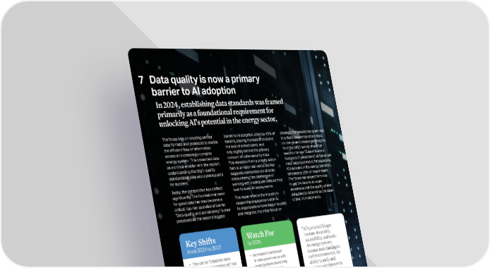 7 Data quality is now a primary barrier to AI adoption In 2024, establishing data standards was framed primarily as a foundational requirement for unlocking AI's potential in the energy sector. The focus was on creating unified data formats and protocols to enable the efficient flow of information across an increasingly complex energy system. This presented data as a critical enabler with the implicit understanding that high-quality, standardized data was a prerequisite for success. Today, the perspective has shifted significantly. The foundational need for good data has now become a critical, top-tier operational barrier. "Data quality and consistency" is now perceived as the second biggest barrier to AI adoption, cited by 45% of leaders, placing it ahead of cost and the lack of skilled talent, and only slightly behind the primary concern of cybersecurity risks. This elevation from a priority action item to a major real-world blocker suggests companies are directly encountering the challenges of working with inadequate data as they look to scale AI deployments. This issue reflects the industry's deepening engagement with AI. As organizations have begun to pilot and integrate, the initial focus on strategic frameworks has given way to a sharp awareness of practical, on-the-ground challenges. Insights from the 2025 survey show that leaders now see "Data utilization/ Accuracy of predictions" as the single most important metric for assessing AI's success in the energy transition, selected by 25% of respondents. The focus has moved from how to get the data to an acute awareness that the quality of that data directly determines the value of their AI investments. “ AI’s potential hinges on data- its quality, accessibility, and scale. As energy systems become more intelligent and interconnected, the ability to unify and analyze vast datasets in real time will define success. The convergence of AI and energy isn’t just about automation; it’s about unlocking insights that drive sustainability, resilience, and innovation at scale.” Jake Loosararian CEO, Gecko Robotics Key Shifts from 2024 to 2025 • The call to "Establish data standards and protocols" has transformed into a present- day obstacle, with "Data quality and consistency" now ranked as the second biggest barrier to AI adoption by 45% of leaders, surpassing even the cost of implementation. • The conversation has moved beyond data infrastructure to business outcomes. "Data utilization/Accuracy of predictions" is now the most important metric for assessing the success of AI in the energy transition. • The energy system of the future will be far more complex, with a dramatic increase in smart meters, sensors, and connected devices. Watch For in 2026 • Increased investment in data governance with organizations launching comprehensive data cleansing and governance initiatives as a prerequisite for major AI projects. • The emergence of specialized roles focused on "data curation for AI" will likely appear within energy companies, tasked with ensuring data is clean, consistent, and fit-for- purpose. • A renewed push for industry standards with the earlier call for pre-competitive data standards gaining urgent momentum. 32