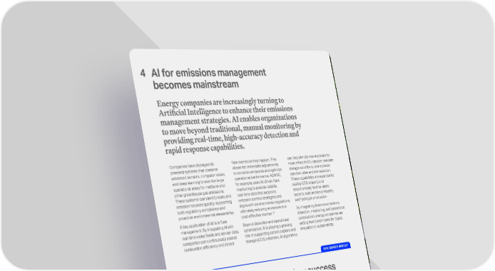 Data and CO 2 reduction are key success metrics for AI within the energy transition Figure 5 Companies have deployed AI- powered systems that combine advanced sensors, computer vision, and deep learning to monitor large operational areas for methane and other greenhouse gas emissions. These systems can identify leaks and emission sources quickly, supporting both regulatory compliance and proactive environmental stewardship. A key application of AI is in flare management. By integrating AI with real-time video feeds and sensor data, companies can continuously assess combustion efficiency and detect flare events as they happen. This allows for immediate adjustments to minimize emissions and optimize operational performance. ADNOC, for example, uses AI-driven flare monitoring to provide reliable, real-time data that supports emission control strategies and aligns with environmental regulations, ultimately reducing emissions in a cost-effective manner. 16 Beyond detection and operational optimization, AI is playing a growing role in supporting carbon capture and storage (CCS) initiatives. AI algorithms can help identify new materials for more efficient CO capture, simulate storage conditions, and optimize injection rates and site selection. These capabilities are essential for scaling CCS projects and decarbonizing hard-to-abate sectors, such as heavy industry and hydrogen production. By integrating AI across emissions detection, monitoring, and operational optimization, energy companies are setting new benchmarks for digital innovation in sustainability. 4 AI for emissions management becomes mainstream Energy companies are increasingly turning to artificial intelligence to enhance their emissions management strategies. AI enables organizations to move beyond traditional, manual monitoring by providing real-time, high-accuracy detection and rapid response capabilities. Grid Stability by Audience: Business Leaders: 26% Business Decision Makers:12% Most Important Metric for Assessing AI's Success in the Energy Transition Data Utilization/Accuracy of Predictions CO 2 Reduction Grid Stability/Reliability Cost Savings Transparency and Accountability Speed of Deployment 25% 19% 19% 16% 11% 9% 2025 SURVEY INSIGHT 16 ADNOC, https://adnocgas.ae/en/sustainability/environment 26