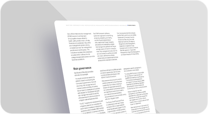 Our unified enterprise risk management (ERM) framework and standard bring together issues related to health, safety, environment, climate, financial and operational risks, within one management system, driving consistency in our risk management practices across the group. This includes an updated risk breakdown structure which defines the risk categories applicable across our entire business operations. Our ERM framework defines a systematic approach to identifying, analyzing, evaluating, prioritizing, monitoring and responding to risks, supported through bespoke processes and enabled by a digital risk management platform serving as a single source of truth for managing risks. Risk management tools, such as and not limited to a unified corporate risk matrix, defined risk attitude statements and established interface across all risk assurance functions. Our risk assurance functions include: Health, Safety and Environment (HSE), Sustainability Executive Function, Information Security, Corporate Business Continuity, Emergency Response & Crisis Management, Corporate Compliance, Legal, Governance & Compliance, Financial Risk Management, Project Risk Management, Fraud Risk Management, and Asset Integrity & Profess Safety. Risk governance Our Board of Directors provides ultimate risk oversight. The Audit Committee assists the ADNOC Board in overseeing the Companys governance, financial reporting, risk management and internal control activities. It reviews the companys strategies and policies with respect to risk assessment and risk management systems and the effectiveness of controls in place to mitigate material business risks. The ELT requires risk assessments and mitigation plans to be completed for each matter it reviews, endorses and approves, which includes HSE matters such as ADNOCs business continuity plans, HSE policies, strategic objectives, strategies and the disclosure of company information relating to production and emissions. The Investment Committee (IC) reviews and endorses the ERM framework and oversees risk data documentation and maintenance, that Risk Action Plans are implemented where appropriate, according to the processes and workflows defined in the ERM standard, and where appropriate, that risk data is communicated effectively to the ADNOC Board of Directors. Risk assessments are performed for matters presented to each Business Leadership Committee, including in respect of organizational matters, non-procurement commercial matters and significant investments matters, and material risks are identified, documented and communicated, along with risk mitigation plans. The Group Chief Financial Officer, in collaboration with each Group company CEO, is responsible for ensuring adequate support for the implementation of ERM activities and providing periodic updates to the ADNOC IC regarding the most significant risks. The CSO is responsible for ensuring that sustainability-related risks are governed through established processes, controls and procedures. The responsibilities related to sustainability oversight are often delegated to specific management- level positions or committees. The Group ERM function is responsible for the effective implementation of the ERM framework across the group. This involves providing guidance and support to Group company ERM departments, facilitating integrated risk and performance reviews and monitoring top risks on a ongoing basis. Group companies have risk management committees and ERM departments in place and continuously maintain and update their respective risk registers and monitor risks to identify Group company risks and their impact on objectives. Risk champions and risk owners are responsible for risk management of specified business functions and for managing action plans respectively. Risk management Risk identification exercises are conducted at least annually. The corporate risk matrix is utilized to consistently assess and prioritize risk based on their potential impact and likelihood against five impact types: HSE, society and reputation, financial, investment value and objectives. For certain risk assurance functions, such as Sustainability Executive Function, bespoke assessment scales are used and calibrated to ERM reporting. We maintain continuous visibility of the top risks across the Group through quarterly reporting from Group companies to their respective business directorates, providing updates on the effective management of risks and their impact on the organization's strategic objectives and business plans. A dedicated in-house ERM training program has been established to promote consistent implementation of ERM activities across the organization and improve the overall risk culture. 131 ADNOC Sustainability Report 2024 HOW WE OPERATE KEEPING OUR PEOPLE SAFE ADVANCING NET ZERO EMPOWERING LIVES SUSTAINABILITY AT ADNOC ABOUT ADNOC PROTECTING NATURE AND BIODIVERSITY