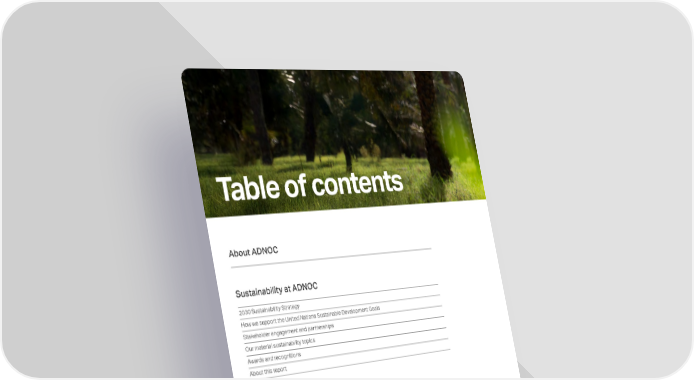 Table of contents 2030 Sustainability Strategy How we support the United Nations Sustainable Development Goals Stakeholder engagement and partnerships Our material sustainability topics Awards and recognitions About this report Sustainability at ADNOC Occupational health Personal safety and work management Safety training and workforce engagement Transportation safety Contractor HSE Incident management system Asset integrity and process safety Emergency preparedness and business continuity management Keeping our people safe About ADNOC Decarbonizing our operations Scaling low carbon solutions Accelerating decarbonization of our industry Advancing net zero