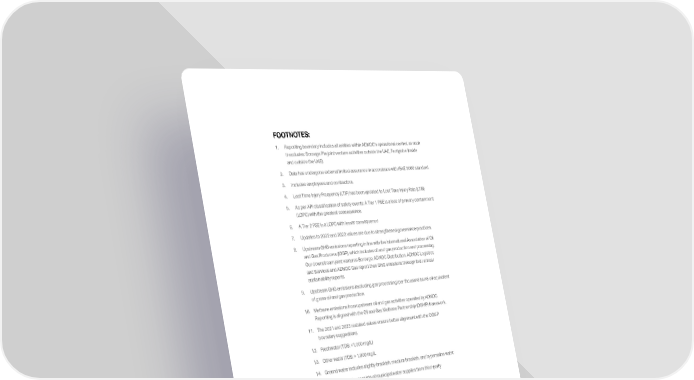 1. Reporting boundary includes all entities within ADNOCs operational control, as such it excludes: Borouge Pte joint venture activities outside the UAE, Fertiglobe (inside and outside the UAE). 2. Data has undergone external limited assurance in accordance with ISAE 3000 standard. 3. Includes employees and contractors. 4. Lost Time Injury Frequency (LTIF) has been updated to Lost Time Injury Rate (LTIR) 5. As per API classification of safety events: A Tier 1 PSE is a loss of primary containment (LOPC) with the greatest consequence. 6. A Tier 2 PSE is a LOPC with lesser consequence 7. Updates to 2022 and 2023 values are due to strengthened governance practices. 8. Upstream GHG emissions reporting in line with the International Association of Oil and Gas Producers (IOGP), which includes oil and gas production and processing. Our downstream joint ventures Borouge, ADNOC Distribution, ADNOC Logistics and Services and ADNOC Gas report their GHG emissions through their annual sustainability reports. 9. Upstream GHG emissions (excluding gas processing) per thousand barrel oil equivalent of gross oil and gas production. 10. Methane emissions from upstream oil and gas activities operated by ADNOC. Reporting is aligned with the Oil and Gas Methane Partnership (OGMP) framework. 11. The 2021 and 2023 restated values ensure better alignment with the OGMP boundary suggestions. 12. Freshwater (TDS: <1,000 mg/L) 13. Other water (TDS: > 1,000 mg/L 14. Ground water includes slightly brackish, medium brackish, and hypersaline water. 15. Third-party water consists of municipal water supplies from third-party distribution companies. 16. Directed to MAGMA waste management facility for treatment and disposal. A MAGMA (formerly known as BeAAT) hazardous waste treatment facility is dedicated to the treatment, storage, and safe disposal of hazardous waste generated by ADNOC and other industries in Abu Dhabi. This facility handles various types of waste, including liquid, sludge, and solid waste, using advanced technologies to ensure environmental protection and compliance with health and safety standards. The MAGMA facility focuses on sustainability by promoting recovery, recycling, and reuse of waste streams whenever feasible. 17. Protected areas are defined by the Environment Agency - Abu Dhabi 18. Includes employees holding the following positions: Associate General Counsel, General Counsel, Vice Presidents, Senior Vice Presidents, Chiefs, Executives, and Directors 19. Ratio of total number of UAE Nationals to the number of positions targeted for Emiratization. This excludes service companies ADNOC Distribution, ADNOC Drilling and ADNOC Logistics & Services. 20. Values were restated from 2023 to reflect changes in the scope of entities. FOOTNOTES: 151 ADNOC Sustainability Report 2024