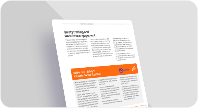 Safety training and workforce engagement The competence and capability of our workforce are paramount to providing for the safety and well-being of our people. ADNOC employs a structured approach to safety training through a comprehensive training matrix, aligning competency requirements with specific job roles. Training is facilitated via diverse HSE training platforms such as e-learning, computer-based training and virtual reality (VR) technology to help equip our employees and contractors with the necessary skills to identify risks, mitigate hazards. This upholds our steadfast commitment to a robust, fully integrated health and safety culture. Since 2020, ADNOC has successfully trained 57,000 employees and contractors in behavior-based safety. Our annual Safety Day unites ADNOCs workforce to reflect on our collective responsibility for safety, reinforcing our culture of care, accountability and operational excellence. In 2024, Safety Day was themed Safety ai Innovate. Safety. Together., emphasizing the synergy between AI and human ingenuity to revolutionize safety performance. With a record- breaking 7,400 participants across virtual, site-based and in-person engagements, Safety Day 2024 set a new standard for scale, innovation and impact. From immersive AI and HSE technology exhibits to dynamic panel discussions featuring global industry leaders, the event underscored ADNOCs dedication to future-ready safety initiatives. A central focus was on human performance principles, encouraging Safety day Safety ai : Innovate. Safety. Together. In 2024, ADNOC trained 40 leaders and more than 12,900 employees on human performance. The content focused on how individual abilities, characteristics and limitations impact overall well- being and productivity, while also setting the tone from the top to embed these principles across the organization. In 2024, ADNOCs leadership teams conducted 2,600 site visits, engaging directly with employees and contractors to assess safety performance, address concerns and reinforce a proactive safety ethos. Through strategic HSE leadership site visits and comprehensive walk- through programs, our leaders actively engage with frontline employees and contractors, reinforcing a 100% HSE mindset and evaluating the robustness of our safety controls. Our annual multilingual safety campaigns significantly raise awareness of critical risks, nurturing a strong safety culture for everyone. employees to remain vigilant, voice concerns and learn from errors, so every team member contributes to a safer ADNOC. Throughout the campaign period, employees participated in townhalls, toolbox talks and leadership site visits, aligning with a shared vision: to innovate, to collaborate and to lead the energy sector in safe, sustainable operations. 47 ADNOC Sustainability Report 2024 KEEPING OUR PEOPLE SAFE ADVANCING NET ZERO EMPOWERING LIVES HOW WE OPERATE SUSTAINABILITY AT ADNOC ABOUT ADNOC PROTECTING NATURE AND BIODIVERSITY