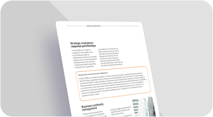 Strategic emergency response partnerships Business continuity management Providing effective emergency management necessitates robust partnerships with essential stakeholders to achieve a coordinated response to both internal and external challenges and to drive continued improvements. ADNOC proactively collaborates with organizations such as RECSO, LASTFIRE, the Civil Defense Authority of Abu Dhabi, the UAE National Crisis and Emergency Management Authority and local authorities to bolster emergency planning, conduct scenario-based exercises and develop unified response frameworks throughout its operations. Marine environmental protection collaboration In 2024, ADNOC successfully concluded a 10-year joint technical cooperation project with the Japan Cooperation Center Petroleum, supported by Cosmo Energy and the Maritime Disaster Prevention Center. The project focused on enhancing ADNOC Groups capabilities in oil spill prevention and response. Key components included conducting tidal current surveys, performing oil drifting simulations, developing an Environmental Sensitivity Index and establishing a comprehensive oil spill response plan tailored to ADNOCs operational environment. The overarching objective was to foster international cooperation in petroleum-related technological development, with a specific focus on marine environmental protection. The project exemplifies long-term collaboration and knowledge exchange between the UAE and Japan. We have worked to implement a holistic management strategy that encompasses strategic planning, risk mitigation and proactive decision- making to streamline business operations, protecting our employees, contractors and communities. ADNOC is dedicated to maintaining a resilient Business Continuity Management System (BCMS) in adherence with UAE NCEMA 7000:2021 standards. Key implementation strategies include: Developing a resilient BCMS for smooth operations during disruptions Establishing a robust BCMS governance framework for effective BCMS management Conducting Business Impact Analyses (BIA) and risk assessments Creating strategies to protect essential operations, reduce disruptions, and achieve rapid recovery Developing Business Continuity Plans (BCPs) and response plans to help the swift recovery of critical operations and strengthen organizational resilience Providing training and raising awareness for preparedness Conducting exercises to validate BCP effectiveness Embedding BCM activities across our operations Regularly reviewing and enhancing the BCMS 57 ADNOC Sustainability Report 2024 KEEPING OUR PEOPLE SAFE ADVANCING NET ZERO EMPOWERING LIVES HOW WE OPERATE SUSTAINABILITY AT ADNOC ABOUT ADNOC PROTECTING NATURE AND BIODIVERSITY