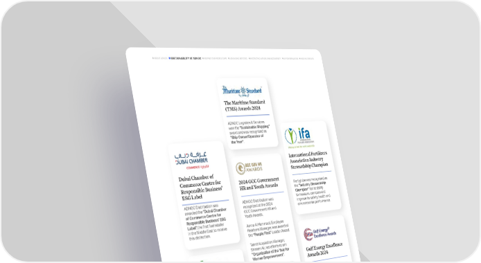 Dubai Chamber of Commerce Centre for Responsible Business ESG Label ADNOC Distribution was awarded the Dubai Chamber of Commerce Centre for Responsible Business ESG Label ,the first fuel retailer in the Middle East to receive this distinction. 2024 GCC Government HR and Youth Awards ADNOC Distribution was recognized at the 2024 GCC Government HR and Youth Awards. Amna Al Hammadi, Employee Relations Manager, was awarded the People First Leader Award. Talent Acquisition Manager, Shireen Ali, led efforts to win Organization of the Year for Women Empowerment . Amit Parashar, Senior Analyst in Talent Development, earned a Certificate of Distinction for his work on ADNOC Distributions Learning & Development Program. The Maritime Standard (TMS) Awards 2024 ADNOC Logistics & Services won the Sustainable Shipping award and was recognized as Ship Owner/Operator of the Year . Ringier Technology Innovation Award Borouge received the Ringier Technology Innovation Award for Borlink LS4201S, a high- performance solution integral to major energy projects such as submarine cables, enabling renewable energy transformation. International Fertilizers Association Industry Stewardship Champion Fertiglobe was recognized as the Industry Stewardship Champion for its ability to measure, compare and improve its safety, health and environmental performance. 2024 Arab Fertilizers Association Sustainability Award Fertiglobe obtained the 2024 Arab Fertilizers Association Sustainability Award during the 36th AFA Technical Conference in Bahrain. Gulf Energy Excellence Awards 2024 ADNOC Offshore's smart helmet solution earned the Best Health, Safety, or Environmental Contribution, Midstream Award" . 35 ADNOC Sustainability Report 2024