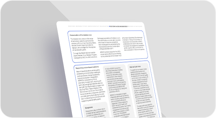 Conservation of the Arabian oryx The Arabian oryx, once on the verge of extinction, owes its survival to the visionary efforts of our Founding Father, the late Sheikh Zayed bin Sultan Al Nahyan, who arranged for the capture of two breeding pairs. Through the Sheikh Mohammed bin Zayed Arabian Oryx Release Program, managed by EAD, the UAE is home to Supporting nature-based solutions Nature-based solutions are integral to addressing environmental challenges, such as climate change, biodiversity loss and ecosystem degradation. ADNOC's tree-planting efforts exemplify this approach, aligning with both UAE and global initiatives such as the UAE Plant the Emirates program and the One Trillion Trees Initiative of the World Economic Forum. Our projects focus on planting mangroves, ghaf trees and date palms, each playing a crucial role in enhancing the environment and supporting sustainability goals. Ghaf and palm trees The ghaf tree is a resilient native species critical to the UAEs desert ecosystem. It supports biodiversity, enriches soil quality and thrives in arid conditions. At Bu Hasa, ADNOC repurposed a former disposal site into an 8,000-square-meter forest featuring over 700 ghaf trees. The forest is sustained by drip irrigation using treated sewage effluent, supported by solar- powered lighting and a wind turbine to reduce resource use. The area is now attracting native birdlife and desert species, enhancing local biodiversity. The date palms are valued for their ability to provide shade and support biodiversity in desert environments. ADNOC has planted more than 6,000 date palms across several operational sites, including Zirku Island, as part of broader landscape and ecological enhancement efforts. Biodiversity monitoring is conducted across these areas to assess habitat conditions and species presence, helping to guide adaptive conservation actions where needed. Mangroves Mangroves play a critical role in strengthening coastal resilience, protecting biodiversity and capturing carbon. In support of the UAEs national target to plant 100 million mangroves by 2030, ADNOC has committed to contribute 10 million mangroves as part of its broader Sustainability Strategy. Since 2023, ADNOC has planted over 2.8 million mangroves, including more than 300,000 in 2024 alone, using advanced drone technology developed in the UAE. As part of our long- term ecosystem restoration efforts, we also replenished areas planted in 2023 to support their continued growth and help us meet our targeted expansion numbers. These achievements were made possible through drone-based aerial seed dispersal, enabling the distribution of over 7 million mangrove seeds to date. In 2024, ADNOC joined the Abu Dhabi Mangrove Initiative, led by EAD, to accelerate mangrove restoration, align local actions, drive research and promote private sector and community participation. ADNOC was also recognized by the Ministry of Climate Change and Environment (MOCCAE) for its contribution to mangrove plantation efforts. ADNOCs mangrove program integrates advanced monitoring tools, including machine learning and normalized difference vegetation index analysis, to track mangrove health and restoration success. Community engagement remains a core pillar of the initiative. In 2024, more than 700 ADNOC employees and 500 student volunteers participated in restoration events, with over 6,500 volunteer hours recorded across 17 sessions. To date, more than 26,000 youth and 990 employees have been engaged in awareness and planting activities. ADNOC Distribution extended this effort to the public by launching the Adopt a Mangrove feature on its mobile app. This allows customers to redeem loyalty points to plant mangroves and track their impact in real time via a blockchain-enabled monitoring system. This initiative makes ADNOC Distribution the first fuel retailer globally to offer customer-led mangrove adoption with transparent digital tracking, connecting everyday consumer action with national and global climate goals. the largest population of Arabian oryx in the world today, a conservation success which saw the species reclassified from endangered to vulnerable by the International Union for Conservation of Nature (IUCN) in 2011. ADNOC actively supports the UAE's conservation efforts by contributing to the protection of the Arabian oryx at its sites in Qusahwira, Das Island and Zirku Island. Through the provision of medical aid, food and shelter, ADNOC collaborates with EAD to help monitor and sustain the Arabian oryx population, reinforcing the UAEs commitment to the conservation of this iconic species. 93 ADNOC Sustainability Report 2024 ADVANCING NET ZERO KEEPING OUR PEOPLE SAFE EMPOWERING LIVES HOW WE OPERATE SUSTAINABILITY AT ADNOC ABOUT ADNOC PROTECTING NATURE AND BIODIVERSITY