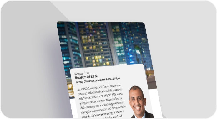 Message from Ibrahim Al Zubi Group Chief Sustainability & ESG Officer At ADNOC, we embrace a broad and human- centered definition of sustainability, what we call Sustainability with a big S. This means going beyond environmental goals alone to deliver energy in a way that supports people, strengthens communities and drives inclusive growth. We believe that energy is not just a commodity, it is a catalyst for social and economic opportunity. Our 2030 Sustainability Strategy is built on tangible action and delivery. It reflects our commitment to a balanced approach that integrates climate action, environmental stewardship and social sustainability. We are scaling up investments in low-carbon solutions, advancing decarbonization and embedding sustainability across our operations. But our strategy goes beyond reducing emissions, it includes empowering local communities, fostering a diverse and future-ready workforce and ensuring responsible governance. This marks ADNOCs second comprehensive Sustainability Report. With it, we continue to demonstrate that sustainability is not a separate track, but an integral part of how we run our business, make strategic decisions and deliver value. In 2024, ADNOC delivered measurable progress against the targets set out in our 2030 Sustainability Strategy and our Net Zero by 2045 ambition. This years Sustainability Report highlights the tangible impact of our actions and our role in delivering responsible energy leadership and long-term value creation for the UAE and beyond. As we look ahead, our focus remains clear: to continue making a positive impact on people, society and the environment. 20