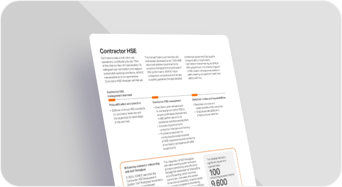 Contractor HSE Contractors play a vital role in our operations, contributing to over 75% of the total number of hours worked. To safeguard our contractors and support sustainable working conditions, ADNOC has established a comprehensive Contractor HSE Management Manual. Prequalification and selection Defines minimum HSE standards for contractor selection and the objectives for each stage of the contract Contractor HSE management standard This manual fosters partnerships with businesses dedicated to our 100% HSE value and outlines requirements for proactive management of contractors HSE performance. ADNOC helps contractors comprehend and adhere to safety guidelines through detailed Strengthening contractor safety partnershipss In 2024, we hosted the CEO Roundtable for Contractor Safety Partnership, bringing together 25 strategic contractor partners. The event's focus was on forming shared commitments and best practices to enhance workplace safety, foster collaboration and support mutual accountability. Enhancing contractor onboarding with SAP Fieldglass In 2024, ADNOC launched the Contractor HSE Management System SAP Fieldglass to enhance contractor onboarding and standardize safety requirements across its Group companies. SAP Fieldglass provides comprehensive visibility of contractors' information through an insightful dashboard, helping compliance with HSE Medical Guidelines and Onboarding HSE Training Certificates. The initiative has had a significant impact with approximately 100 onboarding sessions held for 9,600 attendees, including 3,000 internal users and 6,600 suppliers. This initiative not only fortified ADNOCs contractor relationships but also established a structured engagement platform anchored by quarterly meetings, reinforced leadership commitment and shared goals centered on cultivating a proactive safety culture. To accelerate progress, strategic taskforces were formed around three key areas (worker welfare, The integration of SAP Fieldglass with other existing systems fosters process consistency and efficiency through full automation of onboarding and offboarding, which improves cycle times. Ultimately, this system enhances accessibility, reduces delays and boosts compliance monitoring, contributing to safer and more efficient workforce integration. standardization and HSE solutions) with the objective of driving measurable improvements and aligning contractor practices with global benchmarks. Through these concerted efforts, ADNOC pursues a unified and effective approach to achieving safety excellence across its operations. contractual agreements that specify stringent safety requirements. Contractors receive training on ADNOC HSE programs and are actively engaged in HSE-related campaigns as detailed in safety training, occupational health and safety sections. Definition of roles and responsibilities Describes the roles and responsibilities of key personnel Ensures accountability and effective implementation Contractor HSE management Describes a planned approach to managing contractor HSE to ensure continuous improvement in HSE performance for all contractor activities and facilities Includes requirements for contractor induction and training Provides an approach to monitoring the implementation of HSE requirements and monitoring of contractor compliance with HSE requirements 46