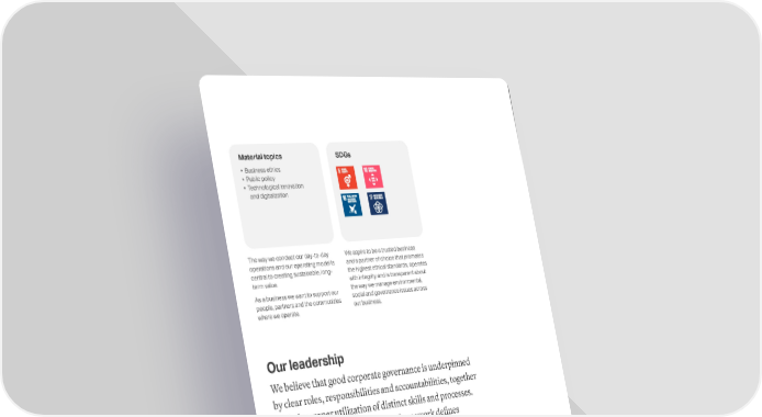 Our leadership We believe that good corporate governance is underpinned by clear roles, responsibilities and accountabilities, together with the proper utilization of distinct skills and processes. Our robust corporate governance framework defines ADNOCs decision-making structure, which enables the delivery of our long-term strategy and daily operations. It sets out the corporate governance structure and mechanisms that support decision-making and assurance processes and systems to maintain effective control. Material topics Business ethics Public policy Technological innovation and digitalization SDGs The way we conduct our day-to-day operations and our operating model is central to creating sustainable, long- term value. As a business we want to support our people, partners and the communities where we operate. We aspire to be a trusted business and a partner of choice that promotes the highest ethical standards, operates with integrity and is transparent about the way we manage environmental, social and governance issues across our business. 124