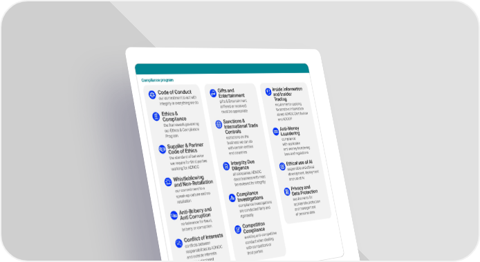 Compliance assessment and monitoring We conduct compliance risk assessments periodically to identify, measure, and update ethics and compliance risks in our business activities, assess current state of controls and develop risk mitigation plans as required. We also assess adherence to the compliance obligations and the compliance program across the ADNOC Group. Compliance program Code of Conduct our commitment to act with integrity in everything we do Ethics & Compliance the framework governing our Ethics & Compliance Program Supplier & Partner Code of Ethics the standard of behavior we require for third parties working for ADNOC Whistleblowing and Non-Retaliation our commitment to a speak-up culture and no retaliation Anti-Bribery and Anti Corruption no tolerance for fraud, bribery, or corruption Conflict of Interests conflicts between responsibilities to ADNOC and outside interests must be disclosed Gifts and Entertainment gifts & Entertainment (offered or received) must be appropriate Sanctions & International Trade Controls estrictions on the business we can do with certain entities end countries Integrity Due Diligence all companies ADNOC does business with must be reviewed for integrity Compliance Investigations compliance investigations are conducted fairly and rigorously Competition Compliance avoiding anti-competitive conduct when dealing with competitors or third parties Inside Information and Insider Trading requirements applying to sensitive information about ADNOC Distribution and ADCOP Anti-Money Laundering compliance with applicable anti-money laundering laws and regulations Ethical use of AI responsible and ethical development, deployment and use of AI Privacy and Data Protection requirements for appropriate protection and management of personal data We work collaboratively with our partners, suppliers, customers and government entities to elevate the collective fight against corruption, demonstrating how integrity and transparency are integral to how we operate. Addressing corruption, internally and collectively, aligns with our company values. All our suppliers, customers and other third parties who work with us are subject to, amongst others, anti-bribery and corruption exposure risk assessments as part of our integrity due diligence process. 134