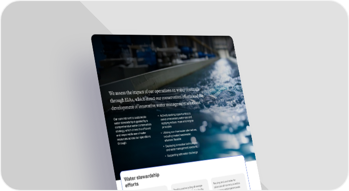 We assess the impact of our operations on water resources through EIAs, which direct our conservation efforts and the development of innovative water management solutions. Water stewardship efforts Ensuring no process or industrial wastewater discharge to the desert Exploring the use of brine from desalination plants as an alternative for water injection Treating and recycling all sewage generated at ADNOC sites for the irrigation of green spaces Deploying mobile, self-contained units for the dewatering and reuse of drilling mud Reusing produced water for enhanced oil recovery, as well as for process and irrigation needs post treatment Mandating grey water treatment and re-using in accommodation design Adopting a no fresh surface and groundwater withdrawal for operations, drilling and well completion activities Employing a hypersaline 23 groundwater closed-loop system to maintain reservoir pressure and enhanced well production Ensuring sustainable groundwater use that does not exceed natural aquifer recharge rates Implementing innovative solutions, fostering efficient water use and reduction at source Our commitment to sustainable water stewardship is guided by a comprehensive water conservation strategy, which drives the efficient and responsible use of water resources across our operations through: Actively seeking opportunities to avoid unnecessary water use and applying reduce, reuse and recycle principles Utilizing non-freshwater alternatives, including treated wastewater, wherever feasible Deploying innovative technologies and water management solutions Supporting safe water discharge 23 Hypersaline groundwater has total dissolved solids (TDS) above 150,000 ppm. 82