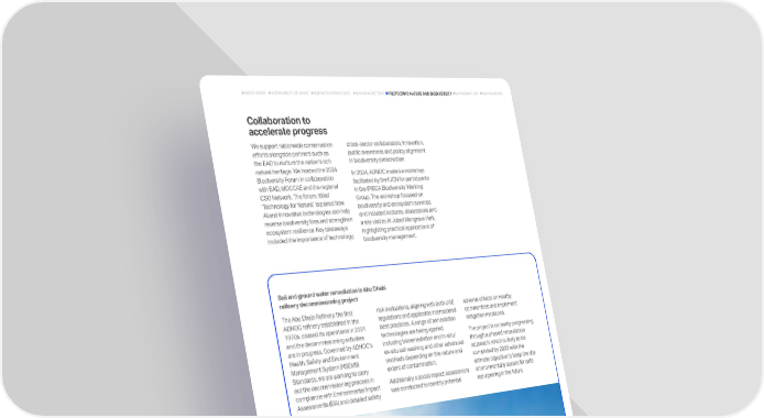 Collaboration to accelerate progress We support nationwide conservation efforts alongside partners such as the EAD to nurture the nations rich natural heritage. We hosted the 2024 Biodiversity Forum in collaboration with EAD, MOCCAE and the regional CSO Network. The forum, titled Technology for Nature, explored how AI and innovative technologies can help reverse biodiversity loss and strengthen ecosystem resilience. Key takeaways included the importance of technology, The Abu Dhabi Refinery, the first ADNOC refinery established in the 1970s, ceased its operations in 2021 and the decommissioning activities are in progress. Governed by ADNOCs Health, Safety and Environment Management System (HSEMS) Standards, we are working to carry out the decommissioning process in compliance with Environmental Impact Assessments (EIA) and detailed safety Soil and ground water remediation in Abu Dhabi refinery decommissioning project cross-sector collaboration, innovation, public awareness and policy alignment in biodiversity preservation. In 2024, ADNOC hosted a workshop facilitated by the IUCN for participants in the IPIECA Biodiversity Working Group. The workshop focused on biodiversity and ecosystem services and included lectures, discussions and a site visit to Al Jubail Mangrove Park, highlighting practical applications of biodiversity management. risk evaluations, aligning with both UAE regulations and applicable international best practices. A range of remediation technologies are being applied, including bioremediation and in-situ/ ex-situ soil washing and other advanced methods depending on the nature and extent of contamination. Additionally, a social impact assessment was conducted to identify potential adverse effects on nearby communities and implement mitigation measures. The project is currently progressing through a phased remediation approach, which is likely to be completed by 2025 with the ultimate objective to keep the site environmentally secure for safe repurposing in the future. 97 ADNOC Sustainability Report 2024 ADVANCING NET ZERO KEEPING OUR PEOPLE SAFE EMPOWERING LIVES HOW WE OPERATE SUSTAINABILITY AT ADNOC ABOUT ADNOC PROTECTING NATURE AND BIODIVERSITY