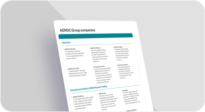 Downstream Industry, Marketing and Trading ADNOC Refining A UAE-based refiner with a global reach, supplying more than 40 million tonnes of high-quality refined products to markets around the world. Borouge A leading petrochemicals company that provides innovative and differentiated polyolefin solutions for the infrastructure, energy, mobility, healthcare, agriculture and advanced packaging industries. ADNOC Logistics & Services A global energy maritime logistics company, delivering energy products to more than 100 customers in over 50 countries. ADNOC Gas One of the worlds largest integrated gas processing companies that supplies around 60% of the UAE's natural gas requirements and serves customers in more than 20 countries. TAZIZ A manufacturing, industrial services, logistics and utilities ecosystem that drives, supports and enables the production of chemicals value chains and transition fuels. ADNOC Global Trading A trading company for our refined products such as diesel, gasoline, jet fuel and naphtha, along with supply feedstocks. Fertiglobe The worlds largest seaborne exporter of urea and ammonia combined, the largest producer of nitrogen fertilizers in the MENA region, and an early mover in sustainable ammonia. ADNOC Distribution The largest fuel and convenience retailer in the UAE that operates fuel service stations across the seven emirates and specializes in selling lubricants across 47 countries worldwide. ADNOC Trading A global energy trading company optimizing the value of ADNOCs crude oil and refined products while enhancing market access and energy security. ADNOC City Gas A local natural gas distribution company in Abu Dhabi, specializing in the supply and distribution of natural gas to residential, commercial and industrial customers. Upstream ADNOC Onshore The oldest oil production company in the UAE, operating 11 oil and gas fields and two export terminals. ADNOC Sour Gas A market leader in sour gas field development and a major international sulfur producer. ADNOC Offshore One of the largest offshore hydrocarbon producers in the world, responsible for the development, production and delivery of oil and gas resources. Al Yasat Petroleum The first joint venture between ADNOC and China National Petroleum Corporation, driving efficient and effective exploration and development of new concession areas, onshore and offshore. ADNOC Drilling The largest national drilling company in the Middle East by rig fleet size, providing integrated drilling services to enhance operational efficiency. Al Dhafra Petroleum A key upstream operator dedicated to unlocking the UAEs hydrocarbon resources through innovative and sustainable energy production. ADNOC Group companies 16